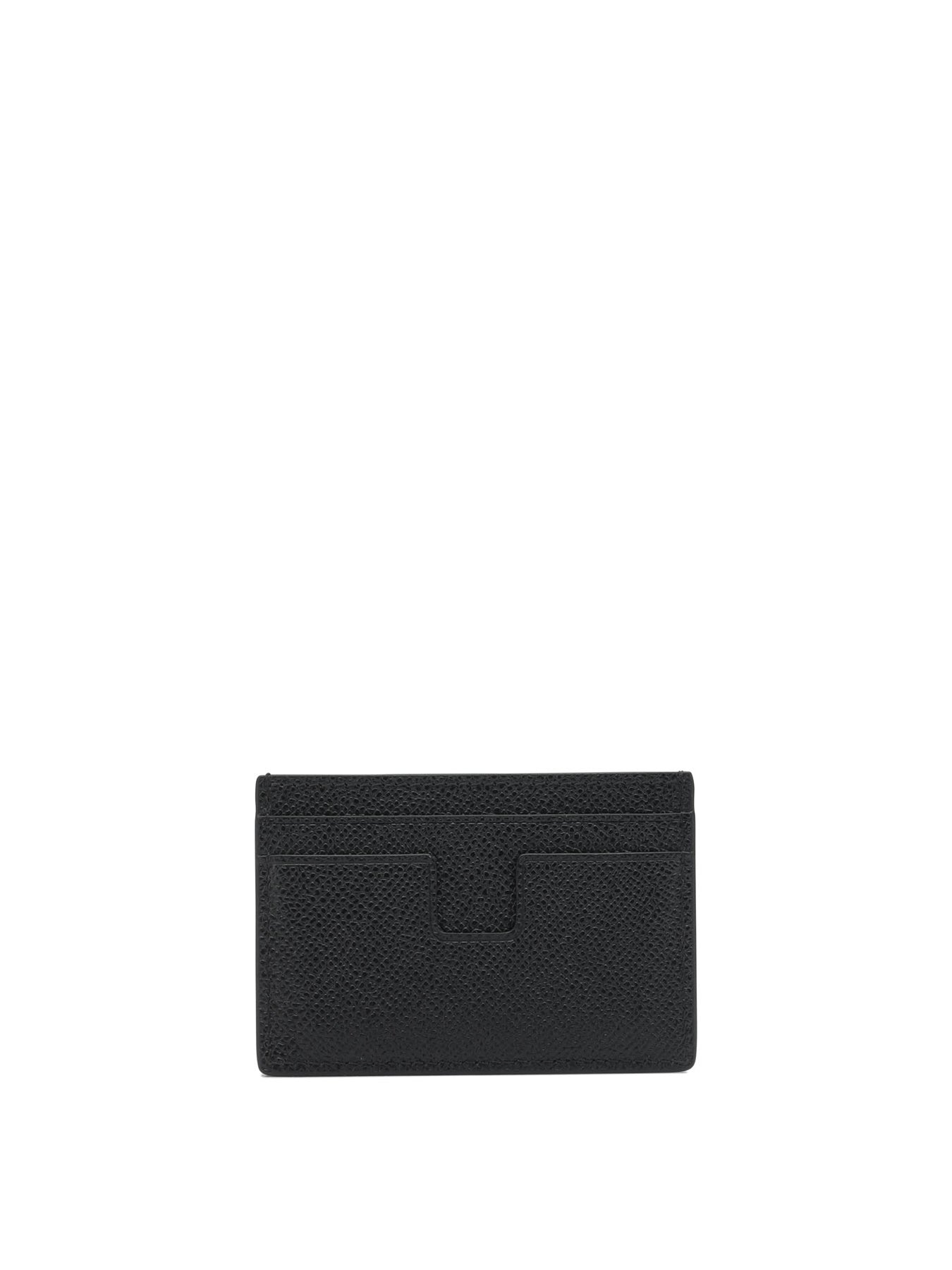 Tom Ford small-grain leather card case made with compact structure and rectangular profile. Five vertical and horizontal storage compartments integrated into the front and back surface. Constructed entirely of small-grain cowhide leather material, with TF logo embossed on the surface. Slim silhouette defined by tone-on-tone linear stitching and finished edges. || - Five card slots - Small-grain cowhide leather - TF logo hot-stamped - Rectangular profile and compact design - Tone-on-tone stitching - Thin structure - Smooth finish on edges
