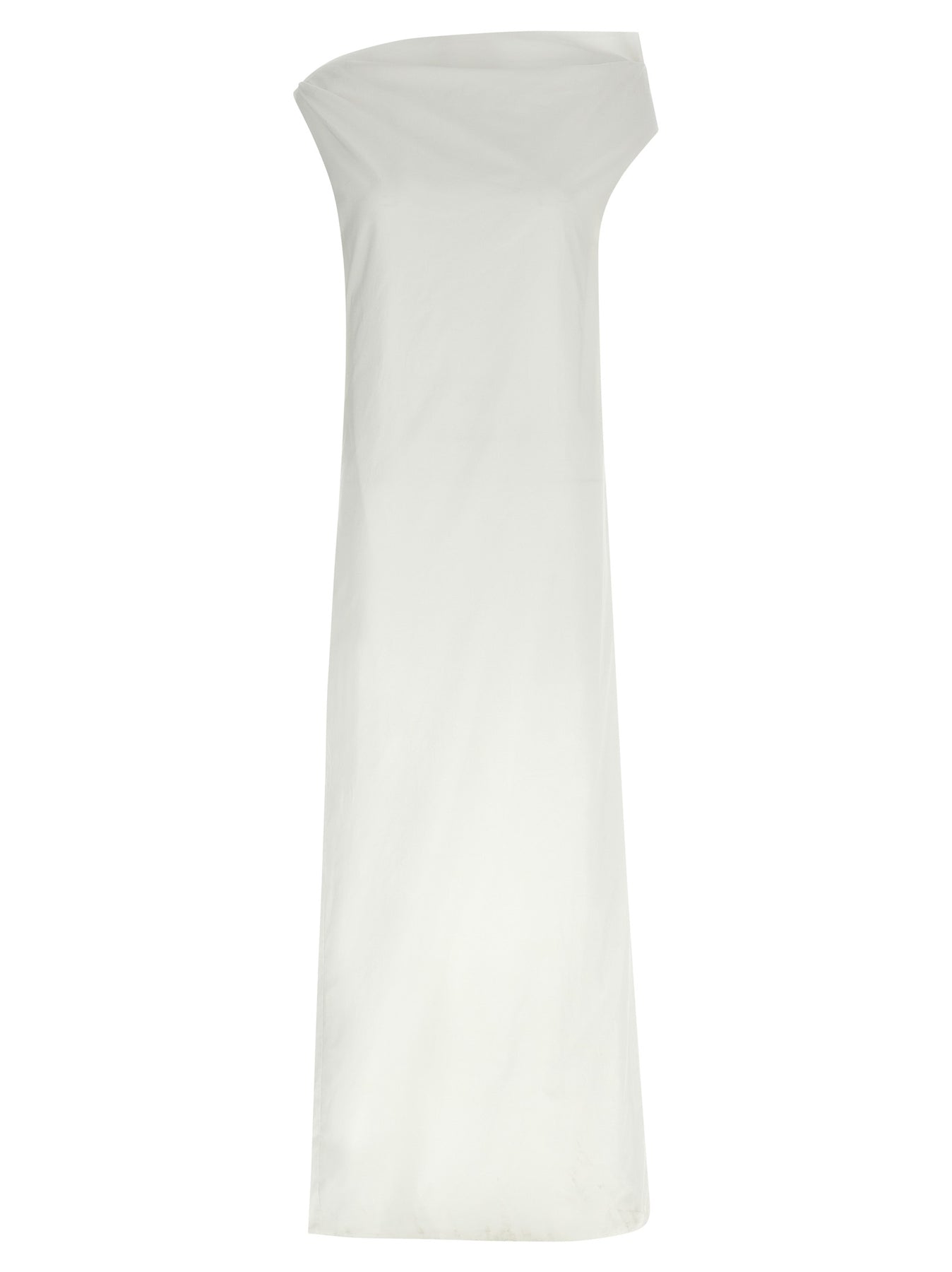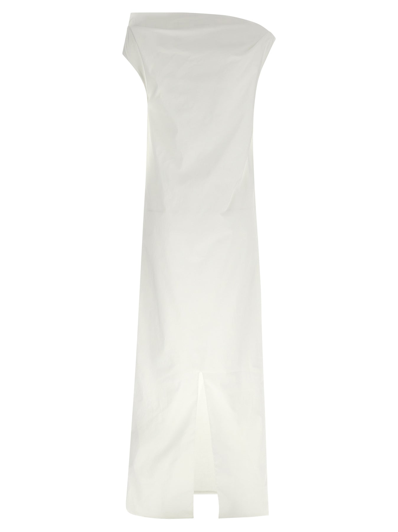 Long 'Tiche' dress in stretch cotton poplin with one shoulder style with draping, asymmetric boat neck, straight silhouette, back slit