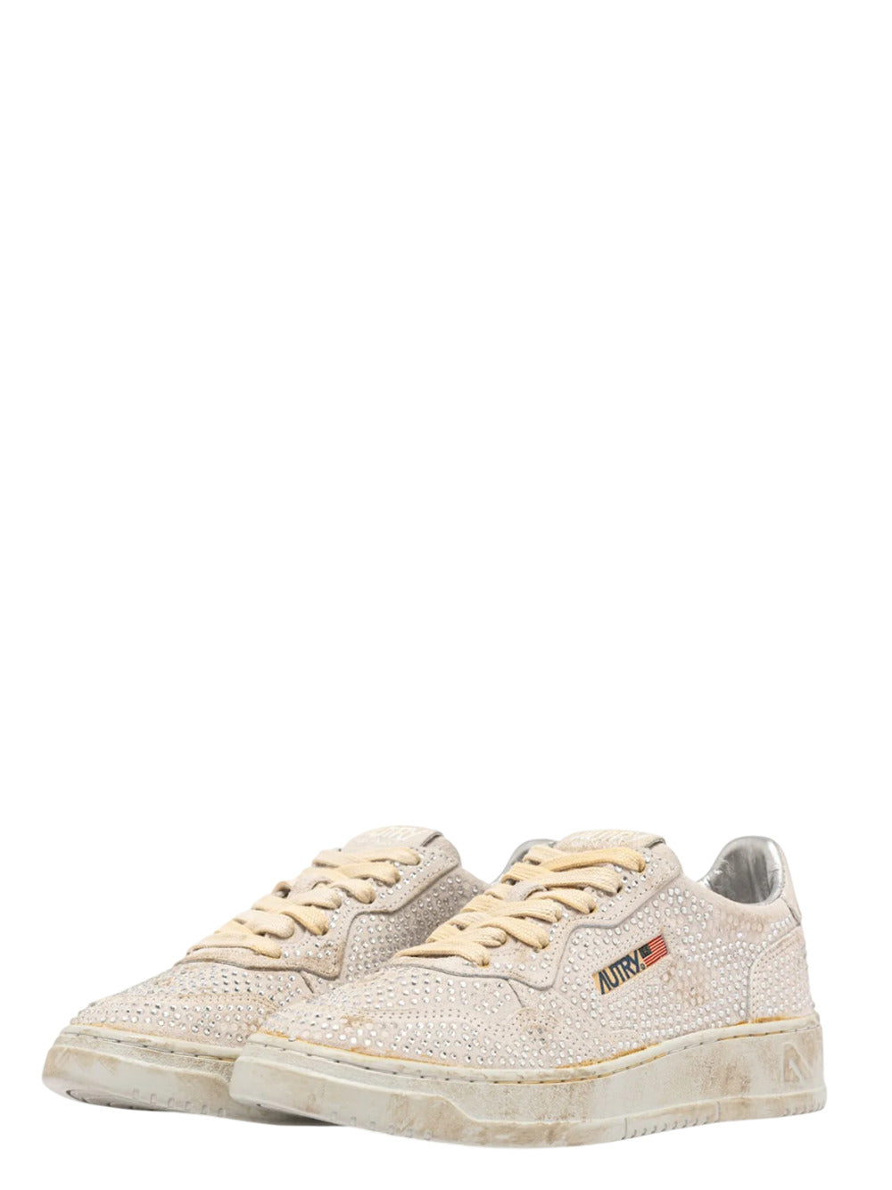 MEDALIST LOW CRYSTAL SNEAKERS IN WHITE MICRO RHINESTONE Autry presents Bloom, the new capsule collection that celebrates femininity in all its nuances. The most iconic sneaker silhouettes are reinterpreted with sophisticated details and unexpected textures: from velvet to laminated leather, from nubuck to suede. Each model reveals a distinctive personality, made unique by romantic floral embroidery, sparkling sequins and glamorous crystals, graphic micro-studs, or oversized bows. Each sneaker becomes a style statement, an authentic and free way to express yourself. FEATURES: Suede and micro rhinestone upper. Flat cotton laces. Embroidered label sewn onto the tongue. Jacquard logo. Padded collar. Leather and cotton terry lining. COMPOSITION: Upper: 100% suede with rhinestones Lining: 40% leather, 50% cotton terry, 10% nylon Sole: 100% rubber ID AULWNA01