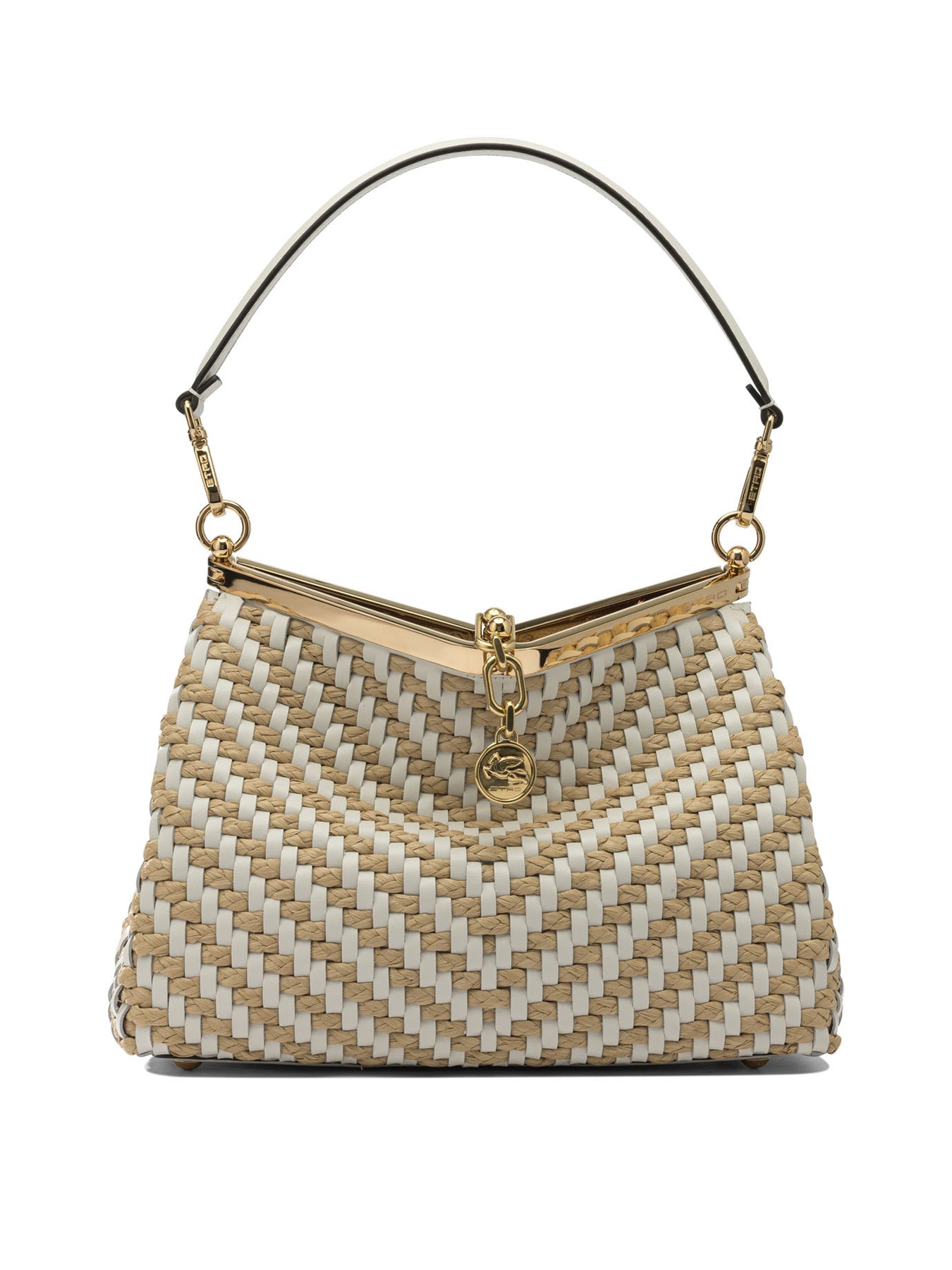 Etro small "Vela" shoulder bag, made of woven raffia and leather. The construction features a rigid structure and a compact silhouette. Metal closure with Pegasus coin detail obtained by coining. The handle is removable for different levels of portability. Metal accessories are finished with gold treatment that completes the functional configuration of the product. || - Woven raffia and leather - Metal clasp with minted Pegasus coin - Removable handle for shoulder carryability - Metal accessories with gold finish