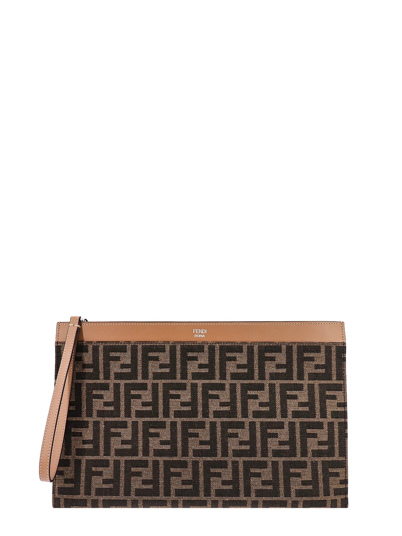 Zip closure with leather slider All-over jacquard FF motif Leather inserts Fendi Roma print Made in Italy Jacquard FF fabric/Leather W: 30.5cm x H: 20cm SKU: 7N0134AFBVF1HRM