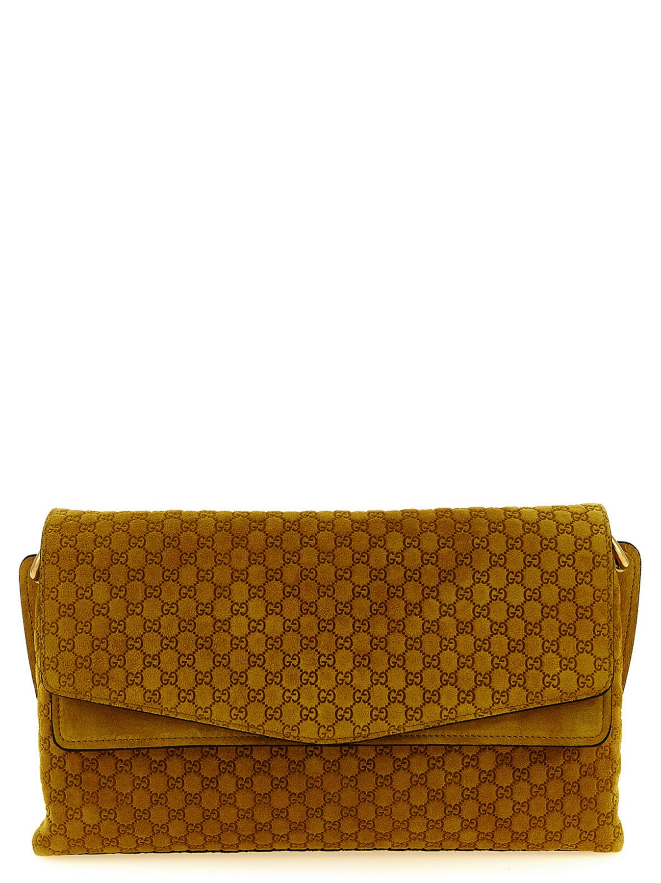 Medium suede shoulder bag with embossed GG, cotton and linen lining, two-bellows construction, magnetic flap closure, antiqued effect chain handle with fixed 'Incrocio GG' detail, adjustable and removable leather shoulder strap.