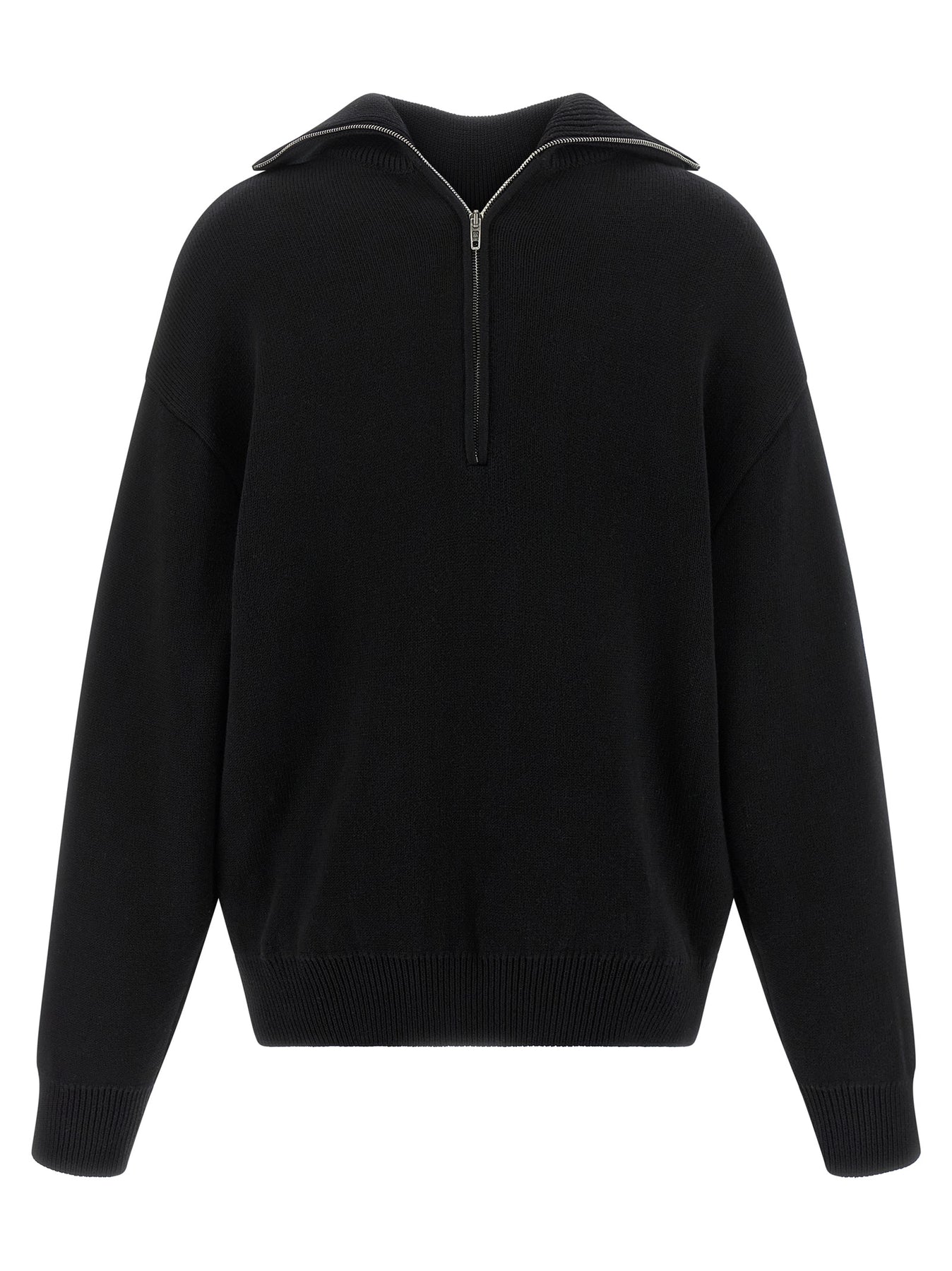 'Back-to-Front' heavy cotton sweater with turned-up turtleneck, back half zip, pockets, long cuffed sleeves and dropped shoulders.
