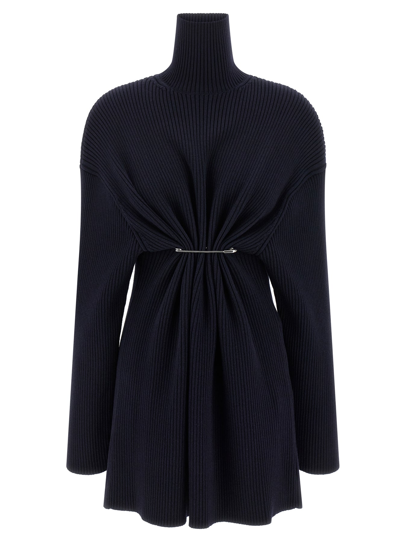 'Pinched' ribbed knit mini dress, high neck with maxi front safety pin detail, long sleeves.