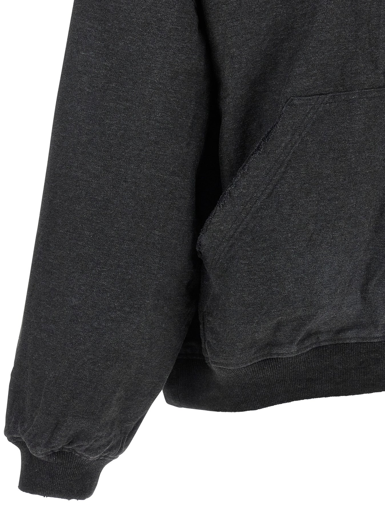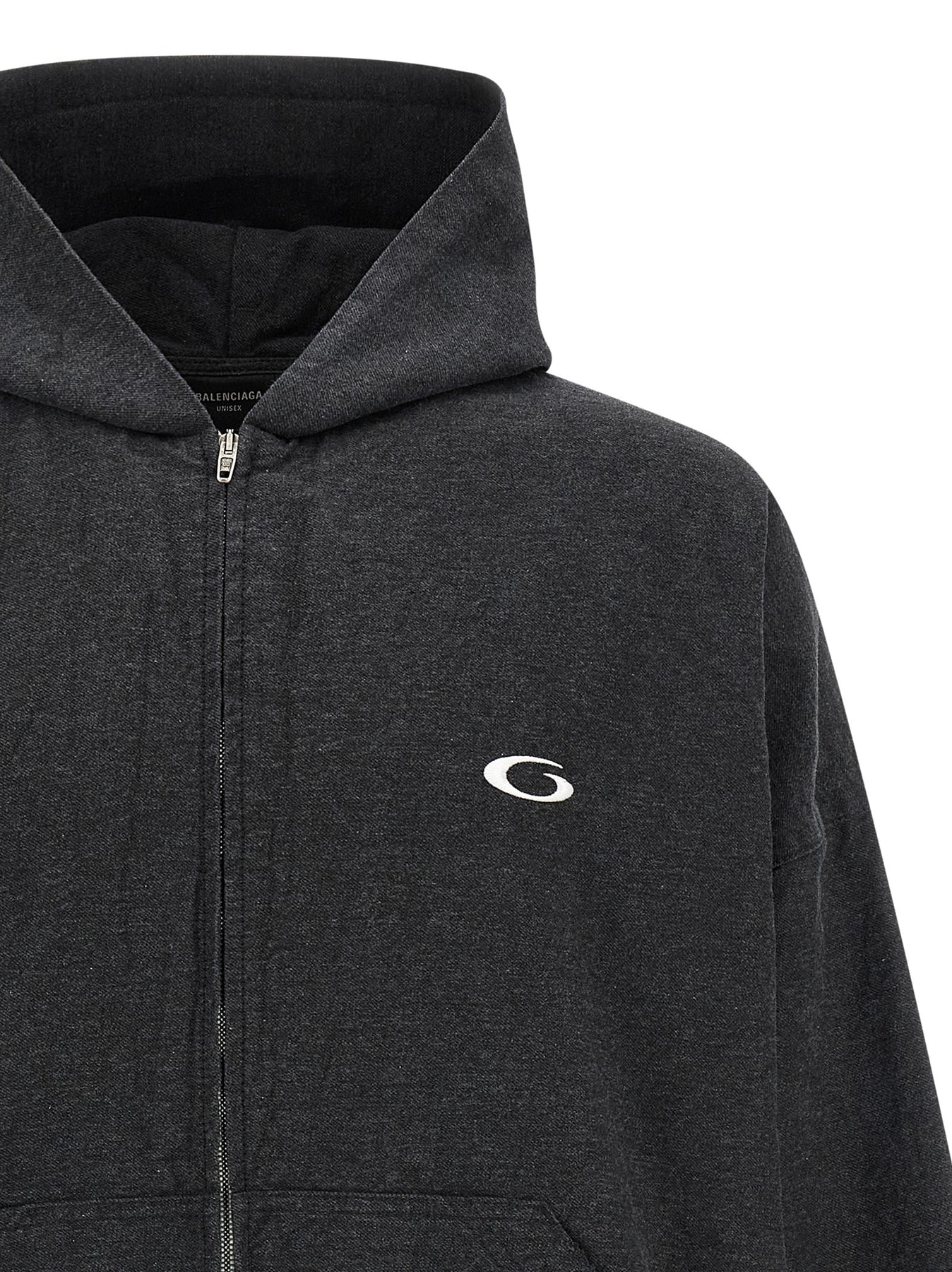 'Trompe L'Œil' used-effect mélange cotton denim hoodie with stretch ribbed knit inserts, 'Loop Sports Icon' embroidery and front zip closure, pockets, long cuffed sleeves and dropped shoulders.