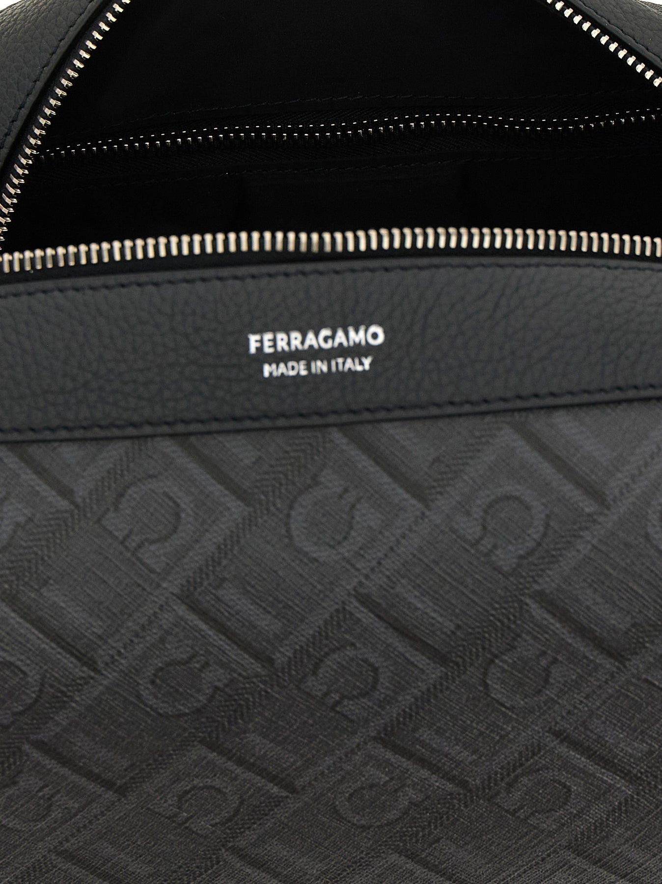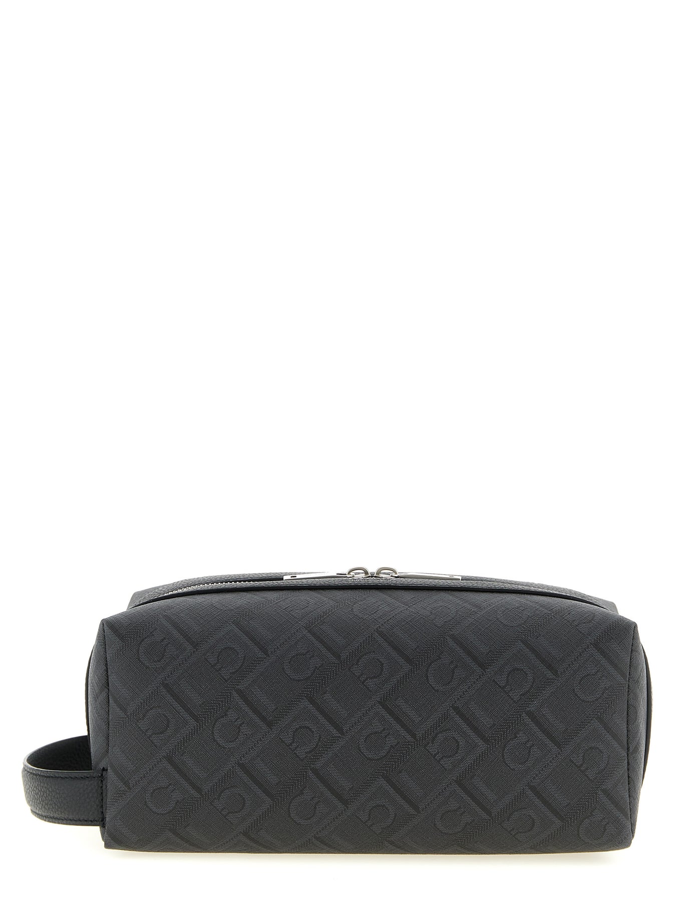 'Dopp Kit' beauty in coated fabric with 'Ferragamo Monogram' print and tone-on-tone hammered leather, embossed logo and top zip closure, handle.