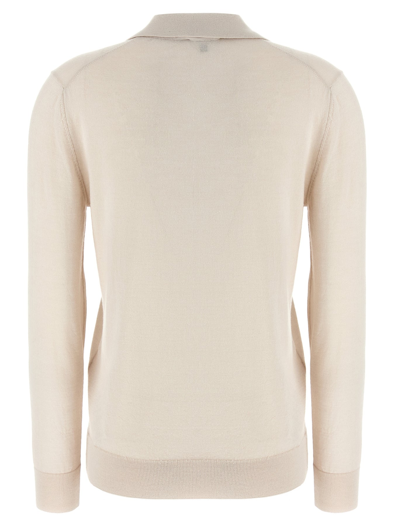 Polo shirt in cashmere and silk blend with 18 fineness, collar and V-neck, long sleeves with cuffs.