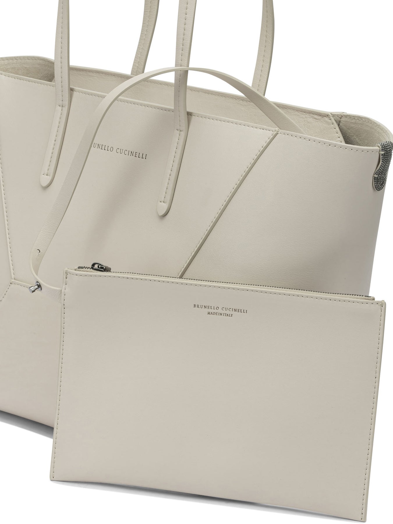 Brunello Cucinelli large "BC Duo" shoulder bag crafted from calfskin leather with a smooth and homogeneous texture, worked with a matte finish. The silhouette features squared lines and solid structure, with exposed stitching emphasizing the minimal profile. The double handle offers shoulder portability, while the internal drawstrings allow you to adjust the shape of the bag, making it more compact. The zippered top closure provides security and functionality. || - Calfskin leather - Top zipper closure - Double handles - Removable interior zippered pouch - Interior side ties to adjust the structure - Nickel-free monile embroidery - Structure with exposed stitching