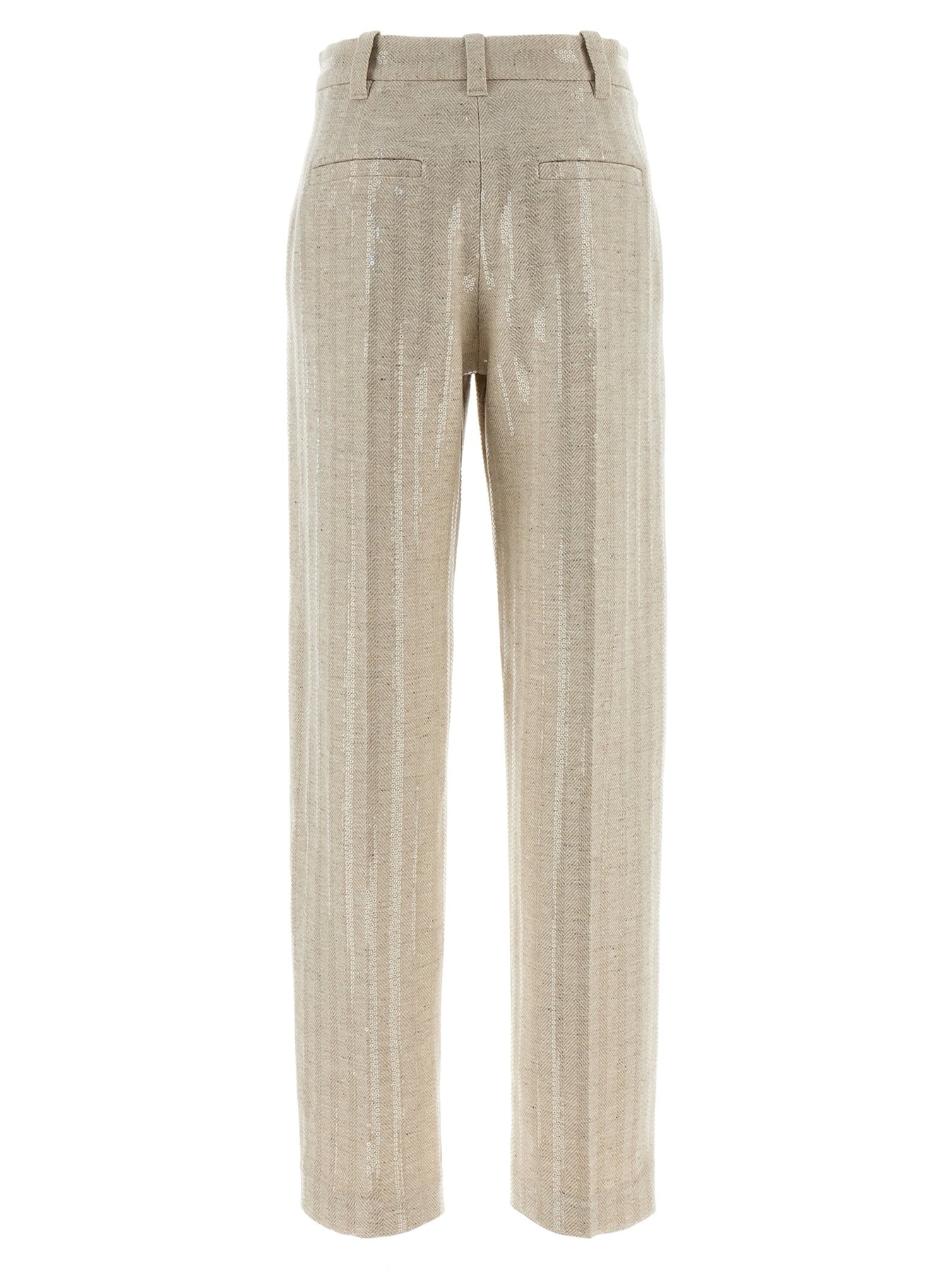 Pants in jacquard wool and cashmere herringbone, sequin embroidery with striped pattern, palazzo model with front stretched pleat, hook and zip closure, side pockets.
