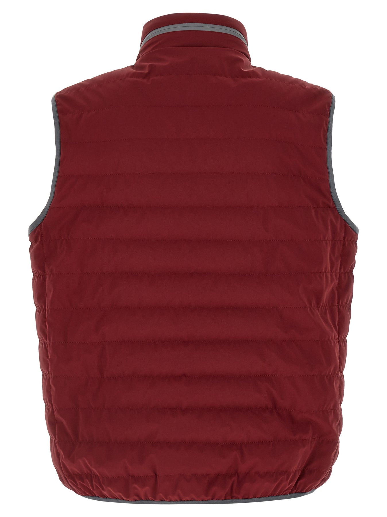 Quilted water-repellent membrane nylon vest lightly padded with goose down and down padding, contrast piping, standing collar with zip closure and removable hood, logo embroidery and front zip closure, pockets.