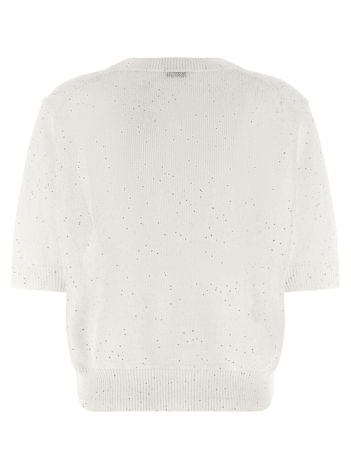 Linen and cotton blend sweater with micro sequin application, crew neck, short sleeves with cuffs, band on the hem.