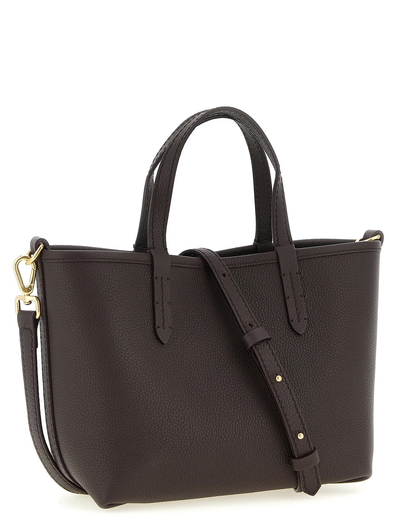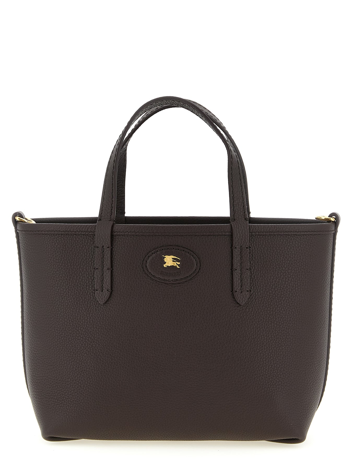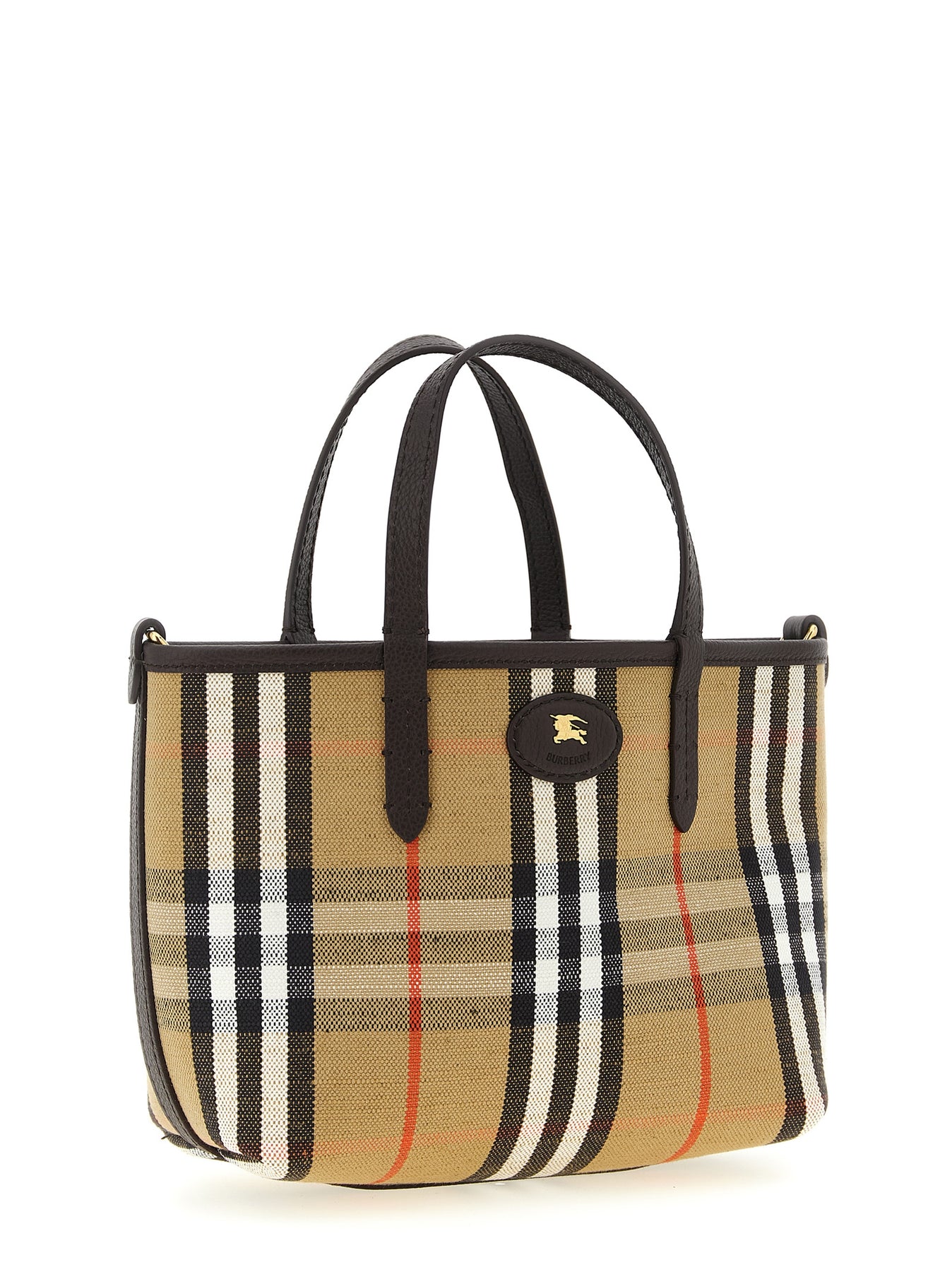 Reversible 'Bloomsbury' mini handbag in grain calf leather and cotton blend and linen woven with Burberry Check, leather patch with front metal 'Equestrian Knight Design' logo, double fixed handle, adjustable and removable shoulder strap.
