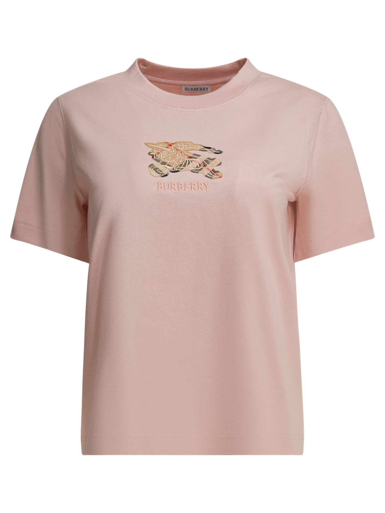 Burberry "Check" crew-neck T-shirt, made of lightweight cotton jersey with regular construction. The garment features a straight silhouette, finished with a ribbed collar and short sleeves. The surface is decorated with Check pattern and embroidered details, including the Burberry logo and Equestrian Knight design on the chest. The construction favors natural textile materials, with no additional inserts or visible seams. || - Embroidered logo on chest - Embroidered Equestrian Knight design - Short sleeves - Ribbed collar - Lightweight cotton jersey - Machine washable - Regular fit