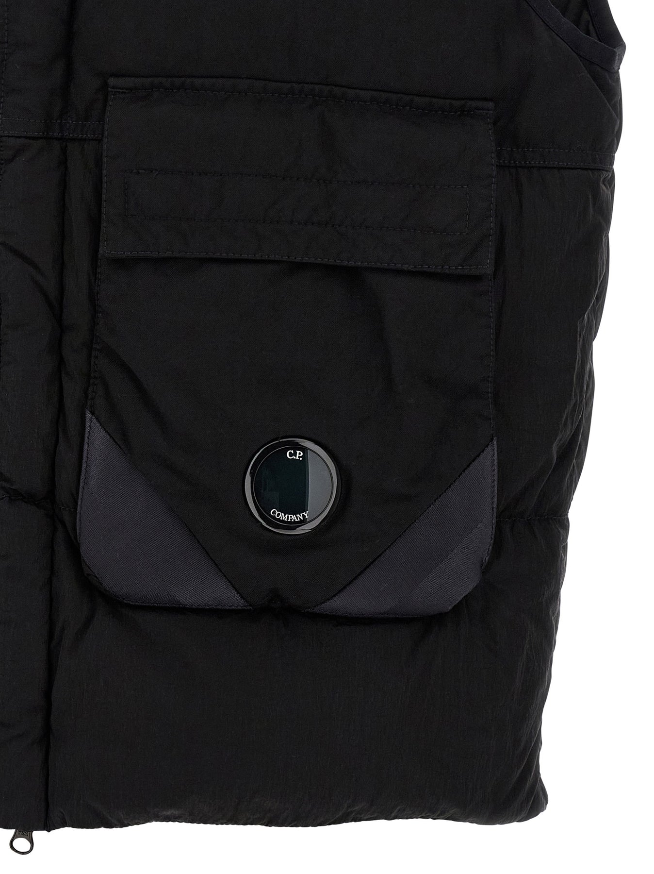 'Eco-Chrome R' vest in quilted and goose feather padding ECONYL® canvas, standing collar with removable hood, zip and snap button closure, pockets with lens detail, drawstring on the hem. SUSTAINABLE: This product is made of ECONYL regenerated nylon.®