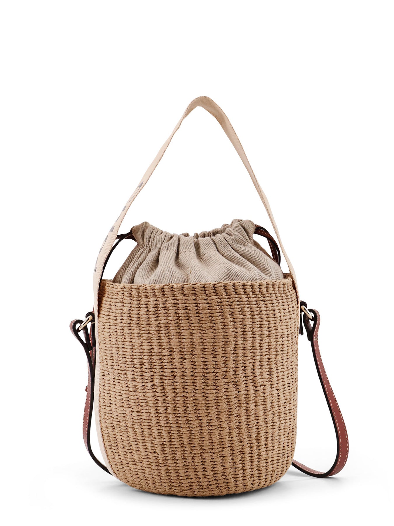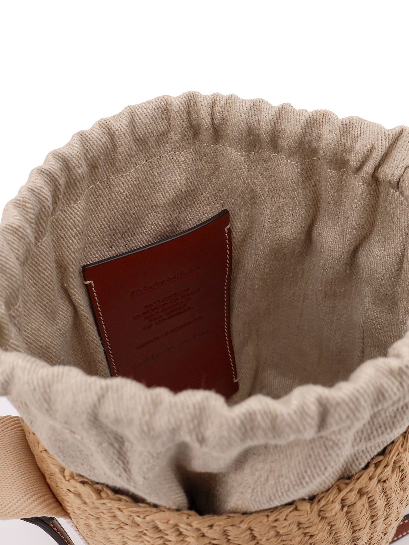 Adjustable leather drawstring closure Leather shoulder strap Canvas handle with logo lettering One flat internal leather pocket Raffia Lining: canvas W: 17 cm x H: 16 cm x D: 16 cm SKU:CHC22SS381G55101