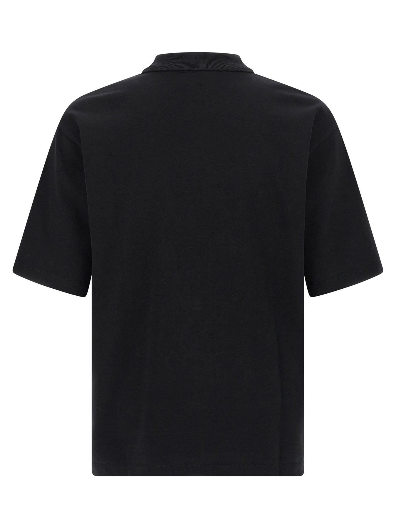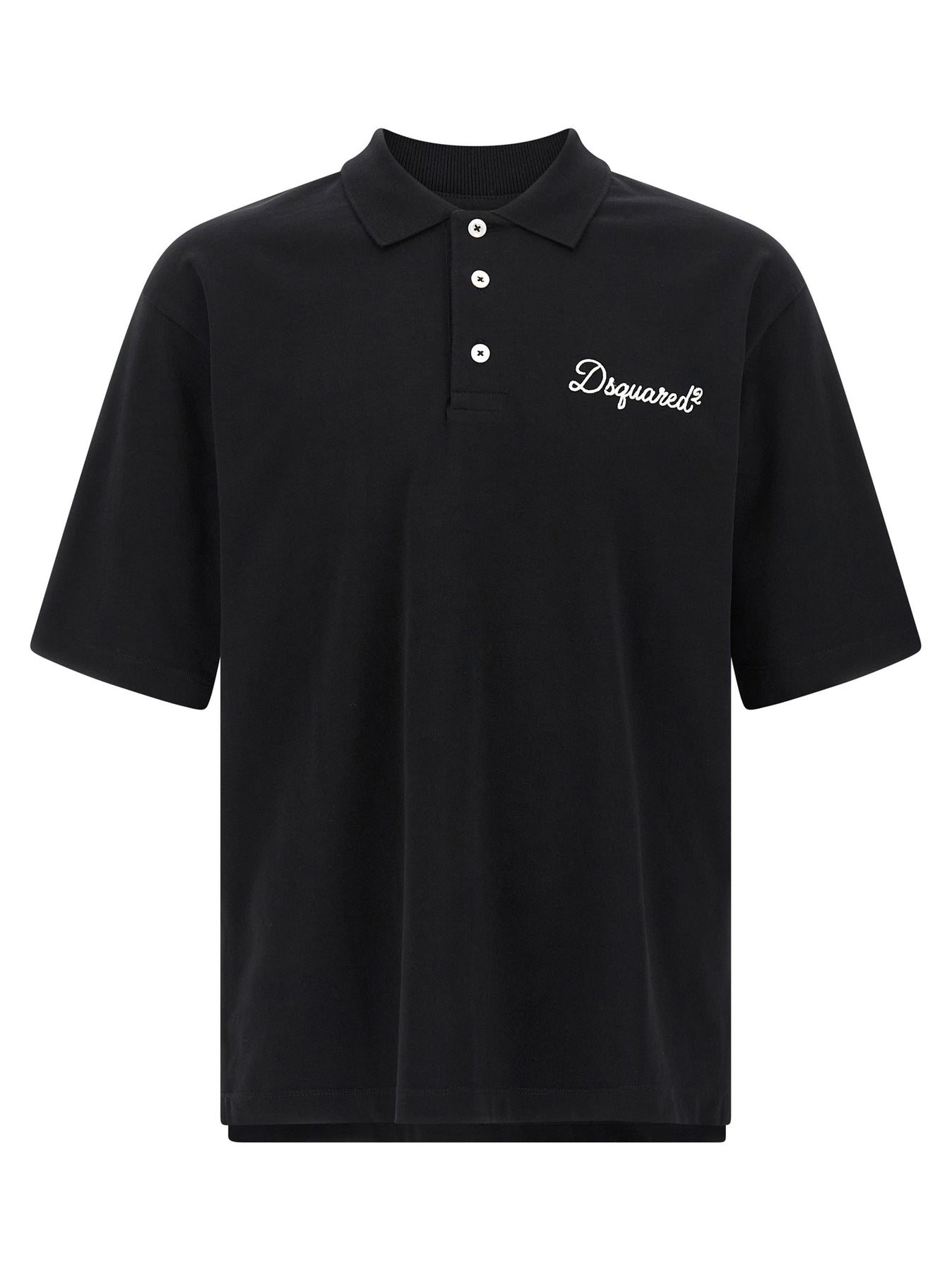Smooth cotton jersey polo shirt with contrast 'Dsquared2 Signature' embroidery on the front, collar and buttons, short sleeves with dropped shoulders, side slits, and asymmetrical hem.