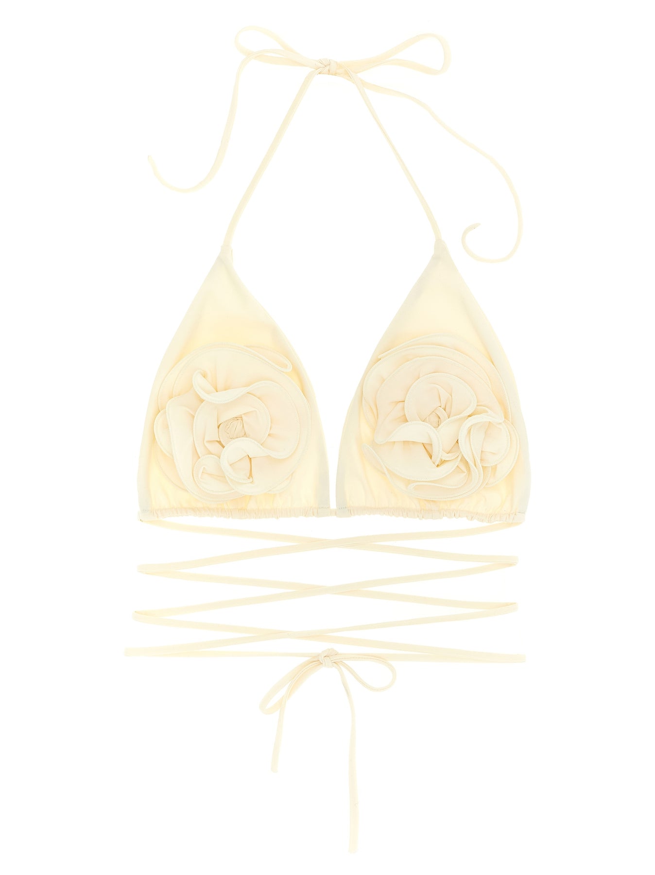 'RE22' triangle bikini top with knotted sliding laces, front floral appliqué.