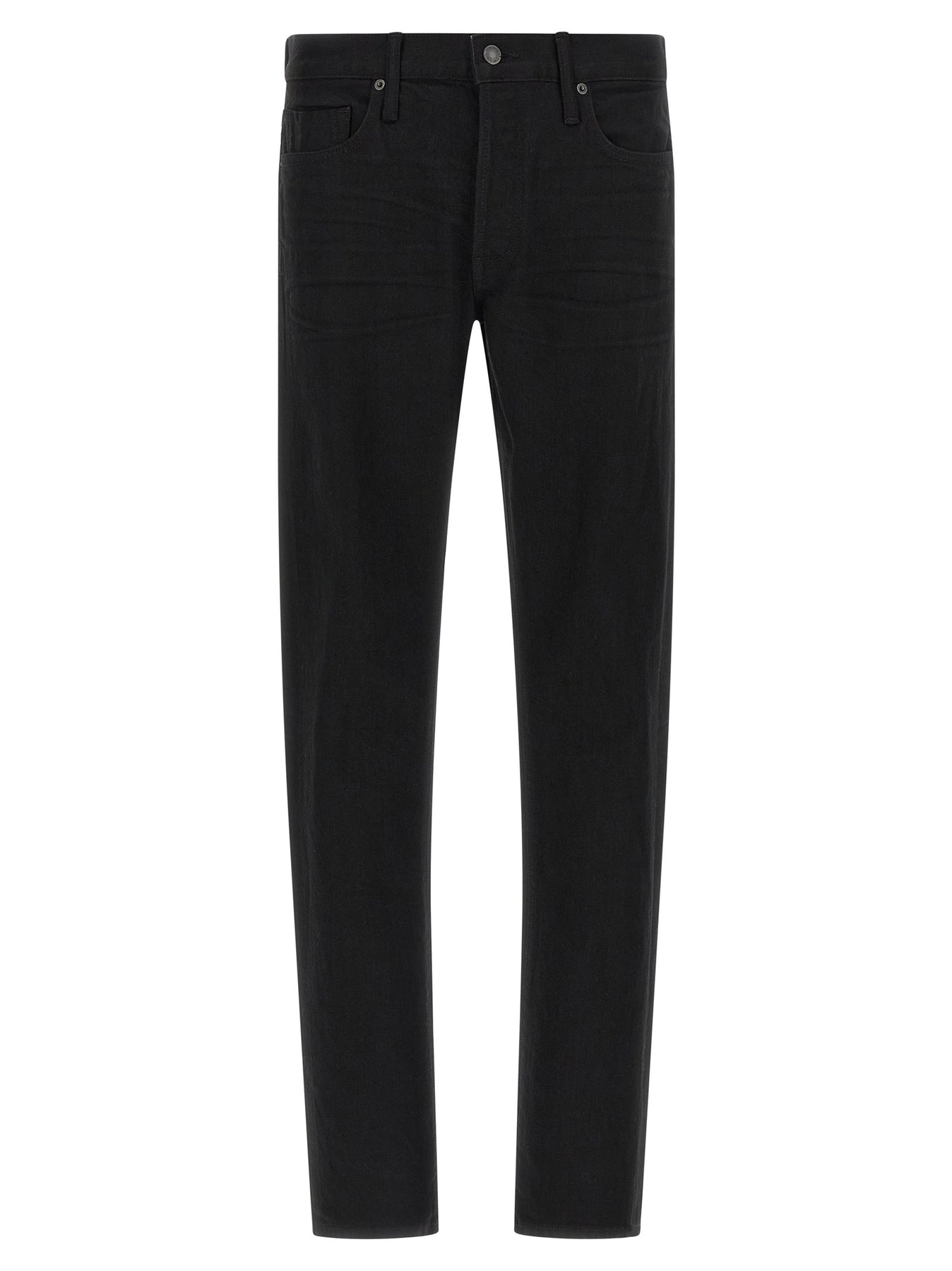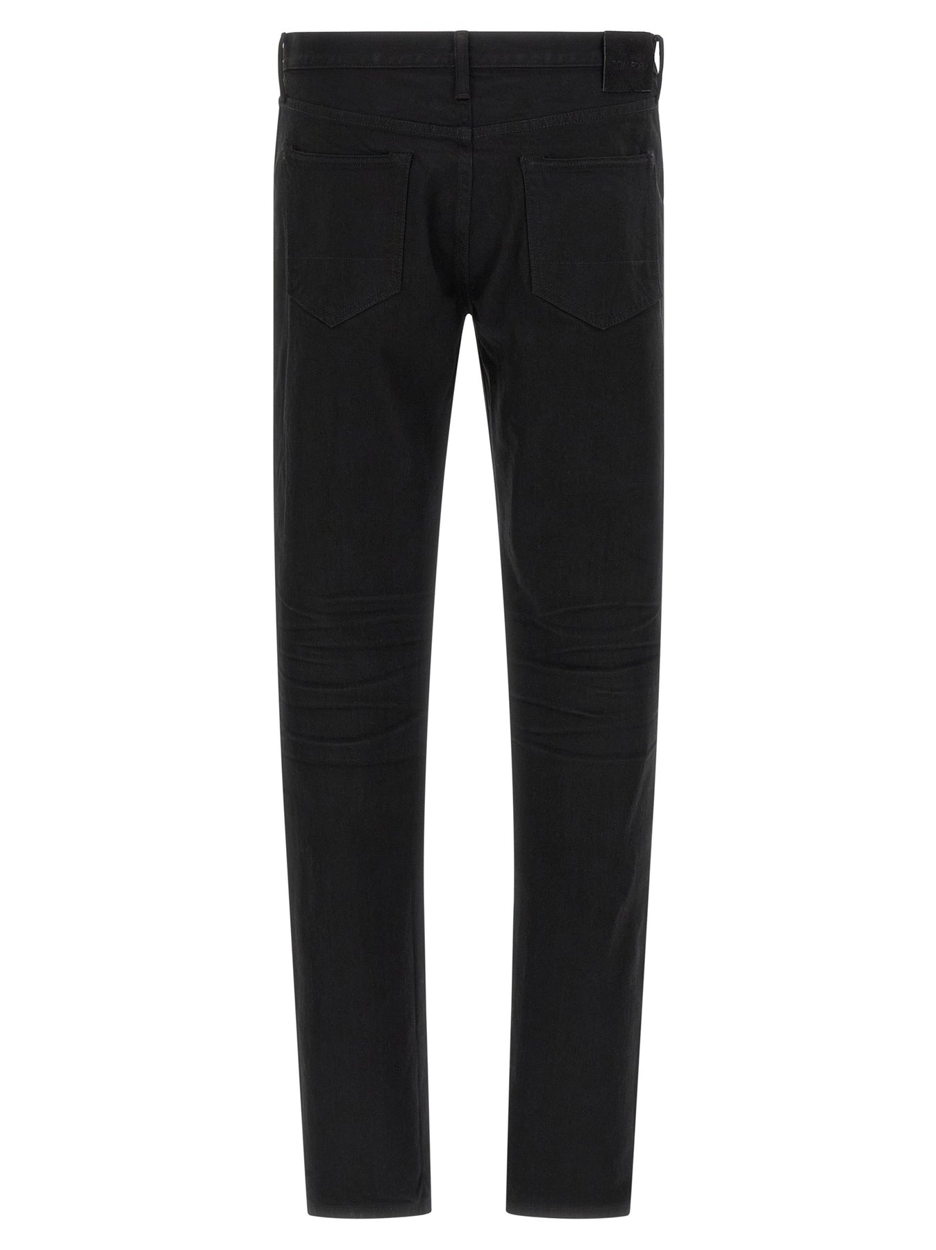 Garment-dyed selvedge stretch denim jeans with straight leg, front button closure, five pockets, tone-on-tone suede logo tag at the back.