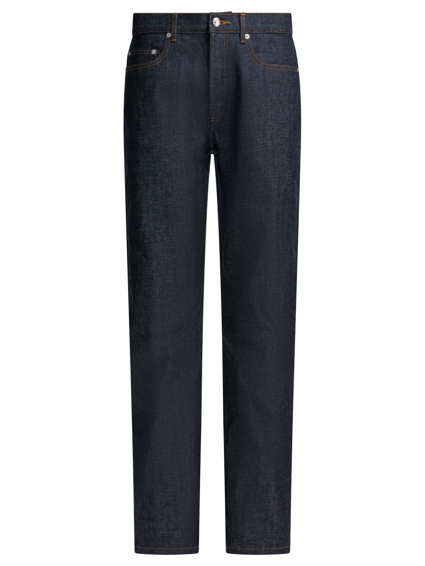 A.P.C. "Rescue" jeans, constructed of selvedge Japanese denim, features a mid/low waist construction and a straight, wide silhouette. The construction includes a buttoned closed flap and trim featuring caramel-colored topstitching and silver-colored metal rivets. The fabric surface and texture offer a precise and soft structural perception, excluding superfluous or decorative details. || - Solid color - Mid-rise - Japanese denim fabric with selvedge - Straight and wide cut - Buttoned flap - Caramel-colored topstitching - Silver-colored rivets - Relaxed fit