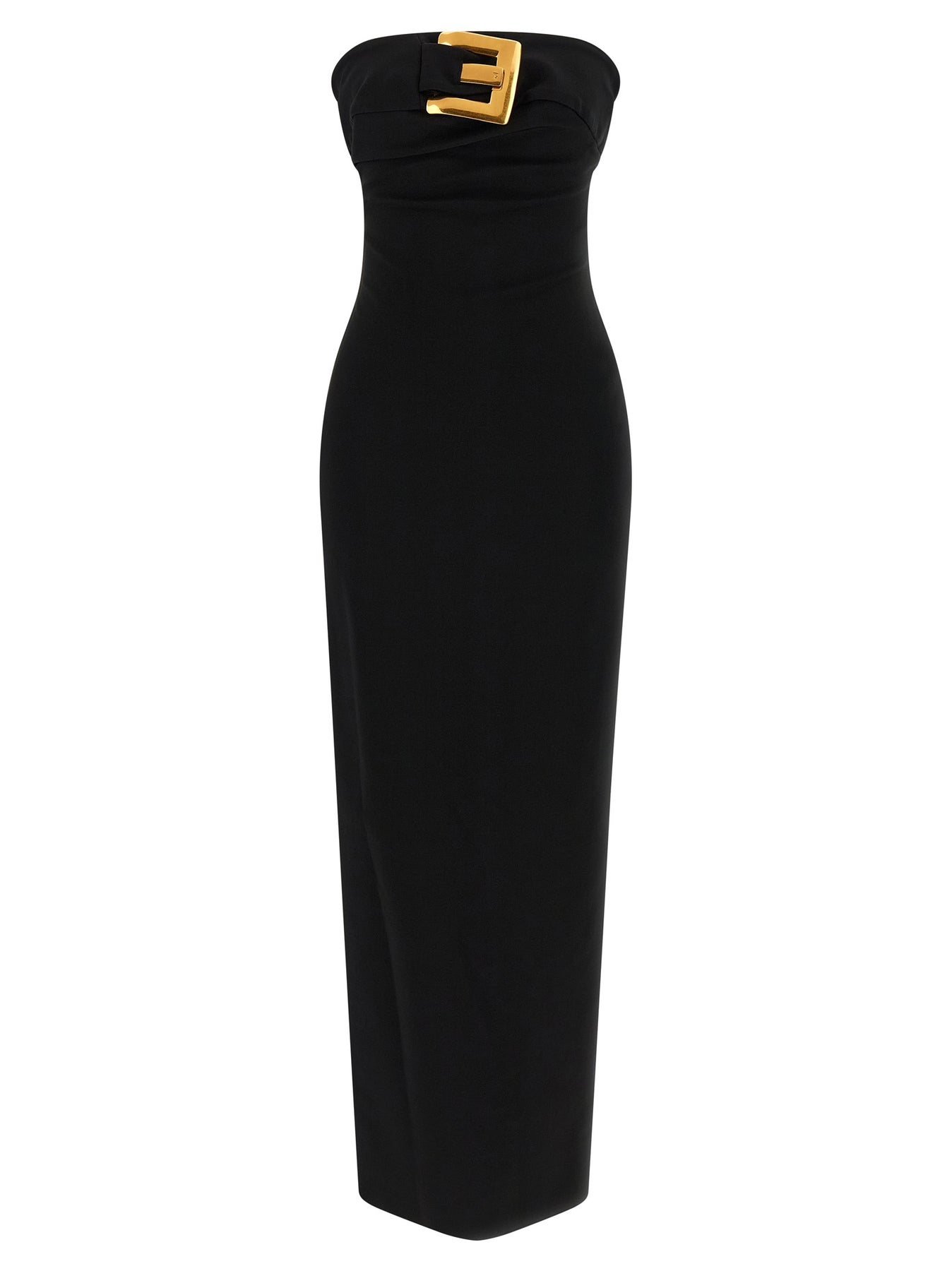 Maxi dress, sheath dress with corsets, belt detail with maxi gold metal buckle, back zip closure, sleeveless.