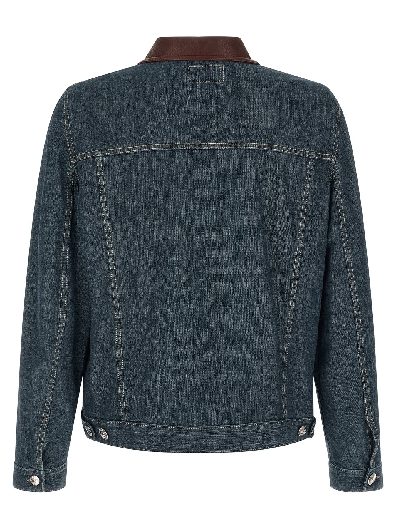 Light pure cotton denim jacket, unlined, contrast stitching, contrast nappa leather shirt collar, front button closure, pockets, long sleeves with cuffs.