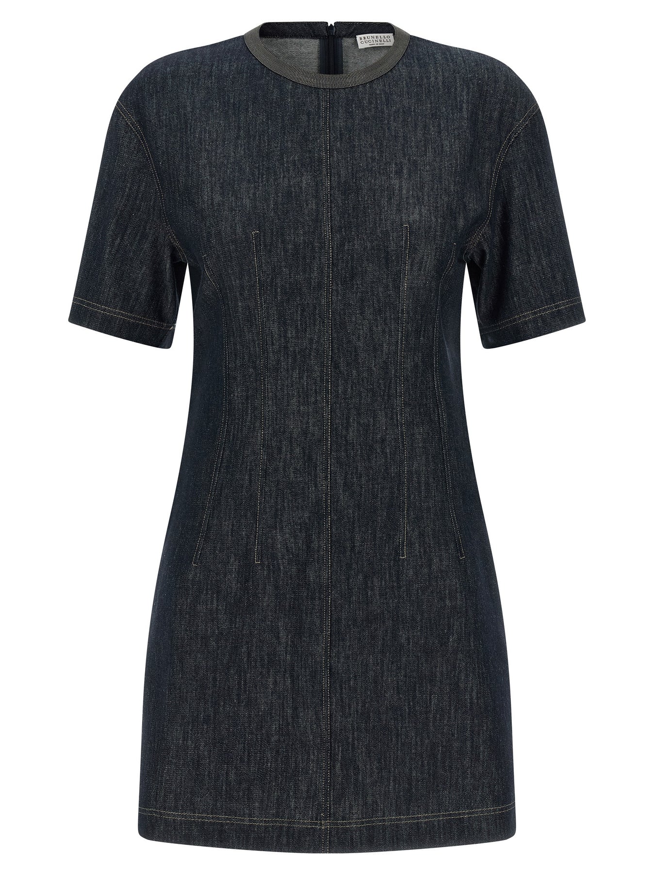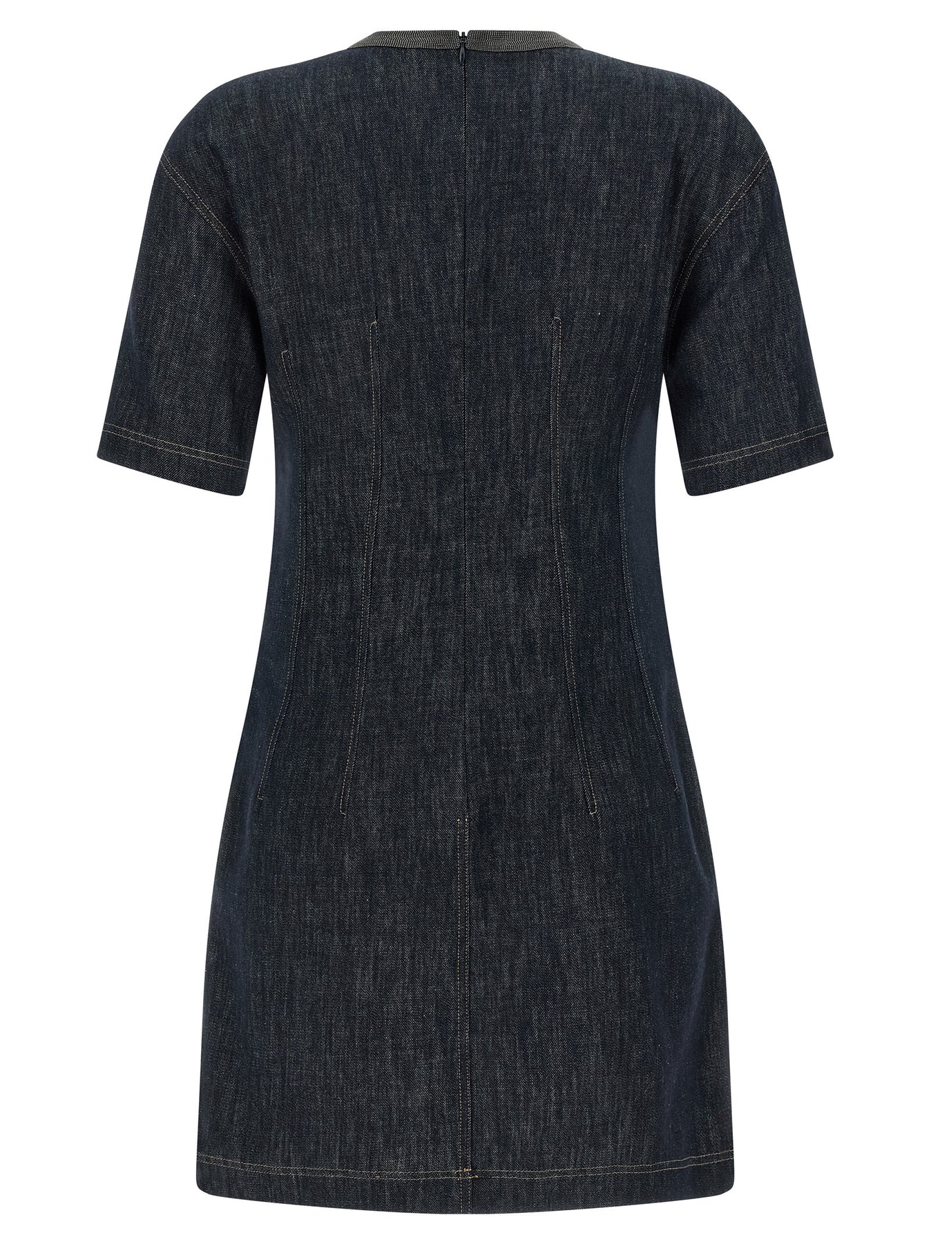 Cotton denim mini dress with contrast stitching, hourglass silhouette, crew neck with Monile detail, pockets, short sleeves, back zip closure.