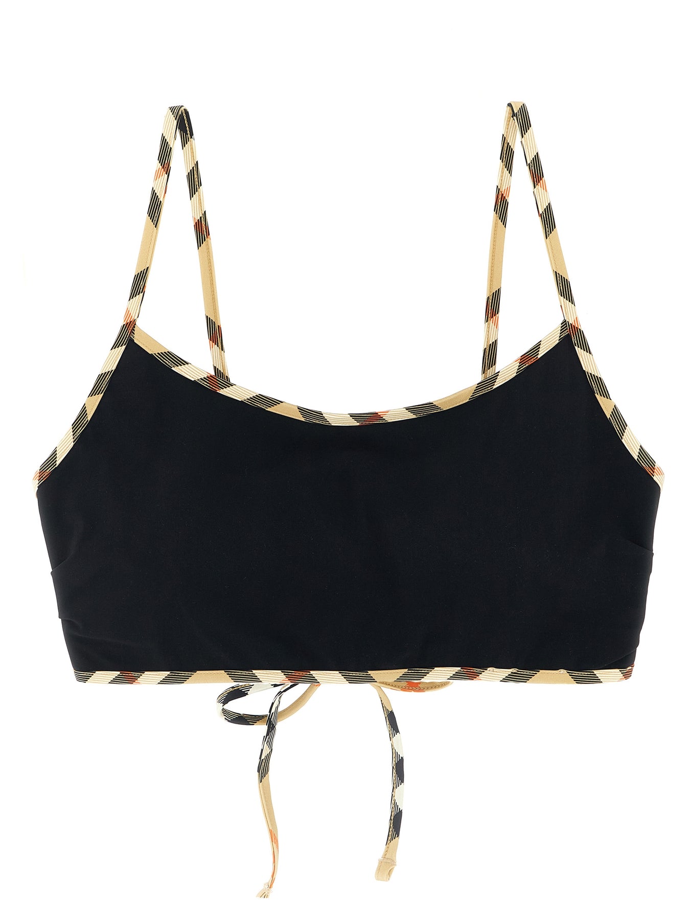 'Starla' stretch nylon bikini top with Burberry Check details, thin straps, cups with removable padding, and back lacing closure.