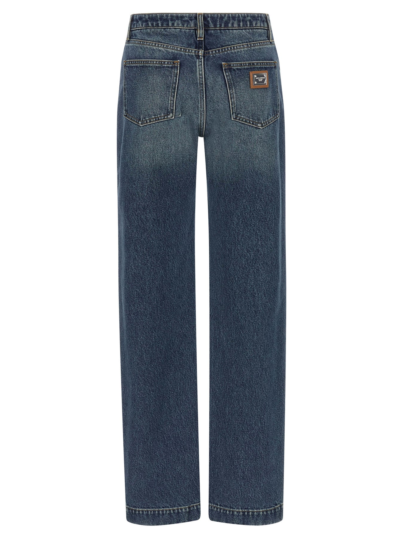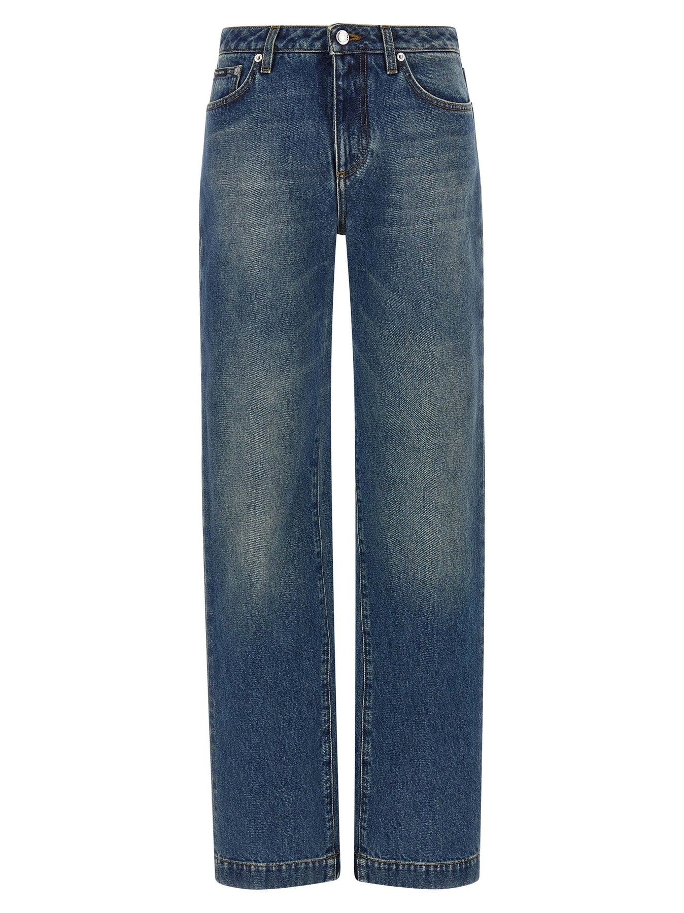 Washed cotton denim jeans, contrast stitching, low crotch, wide and straight leg, front zip and button closure, five pockets, leather and metal tag with the engraved back.