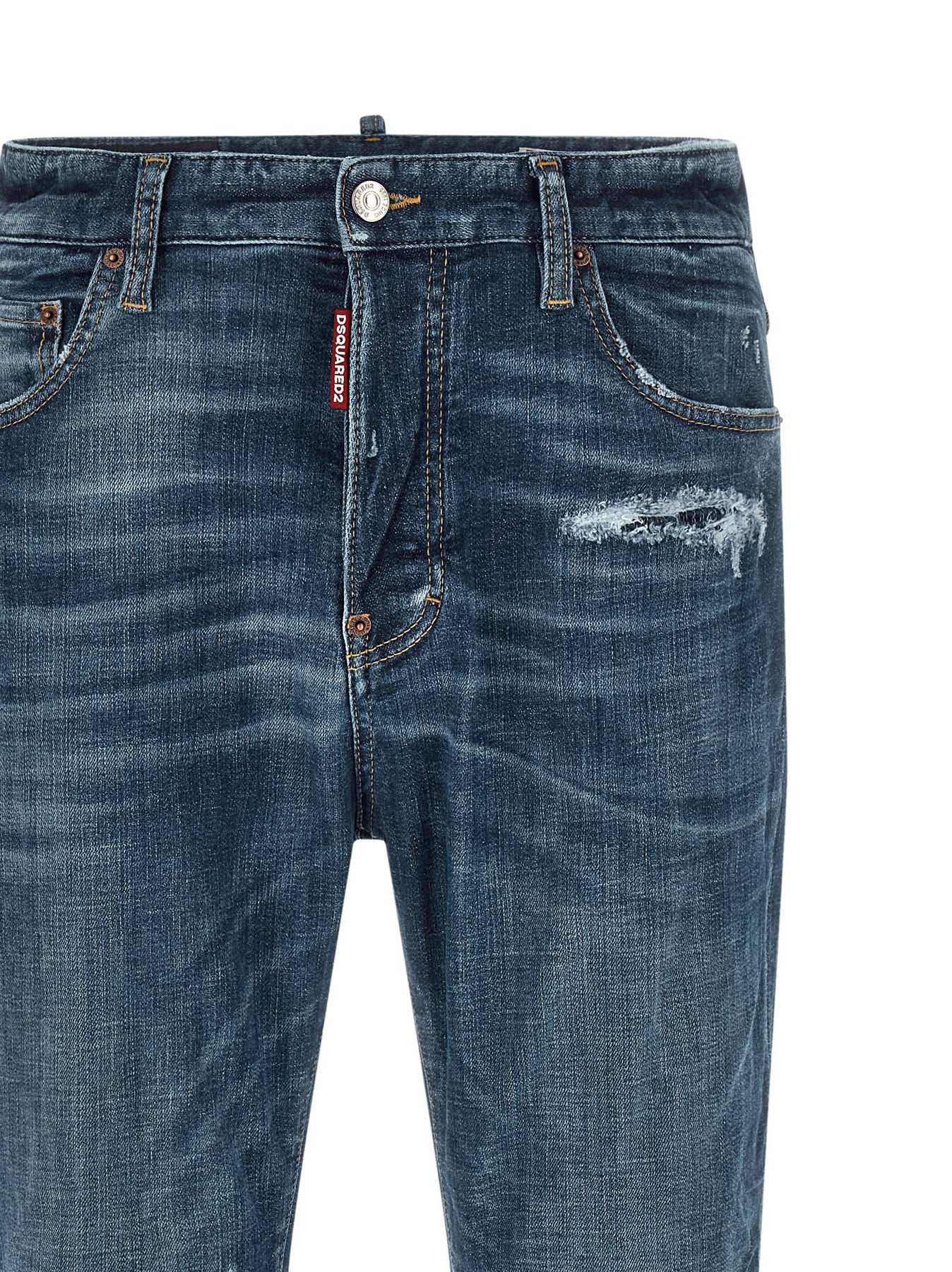 '642' used-effect stonewashed stretch cotton denim jeans, contrast stitching, straight leg, front button closure, five pockets, back leather logo tag.
