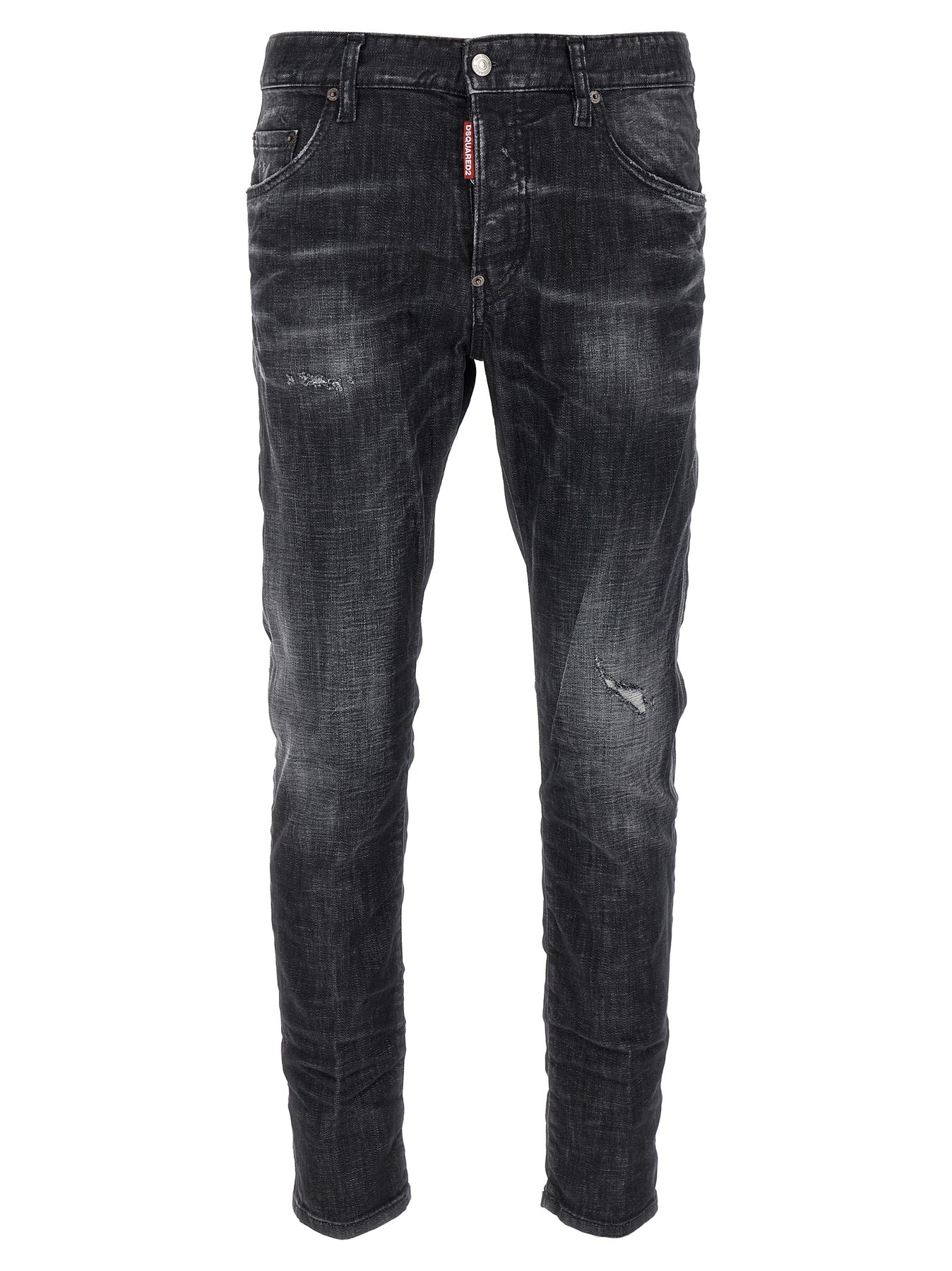 'Skater' stretch cotton denim jeans with used-effect details, button closure, five leather logo pockets.