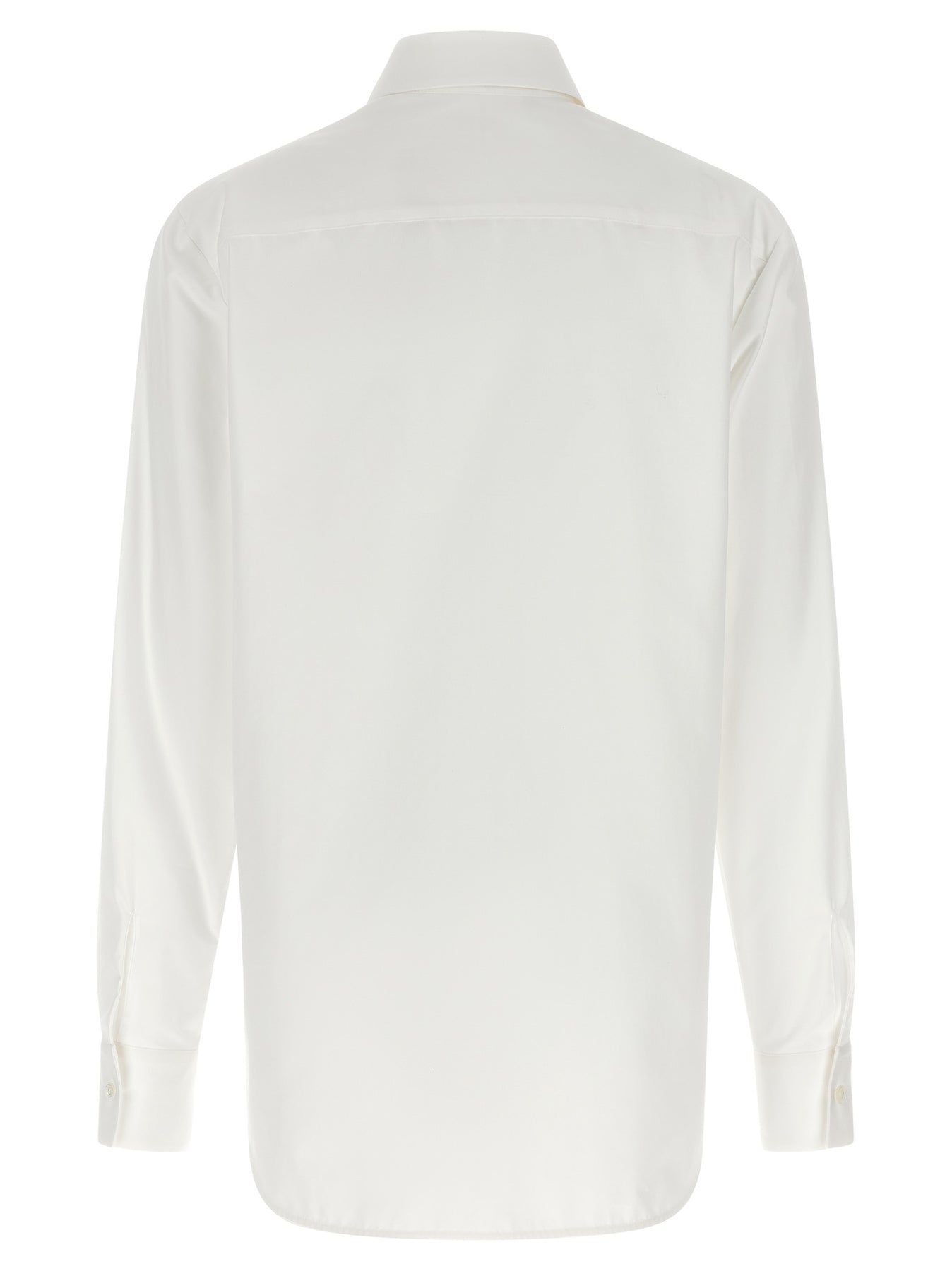 Cotton poplin shirt with embroidery and floral cut-out details, front button closure, long cuffed sleeves, and asymmetrical hem.