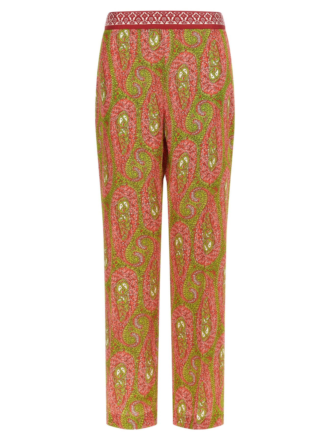 All-over 'Paisley foliage' twill fluid pants, high waist, slightly crop cut, bootcut pattern, stretched pleat, back elastic waistband, side zip closure.