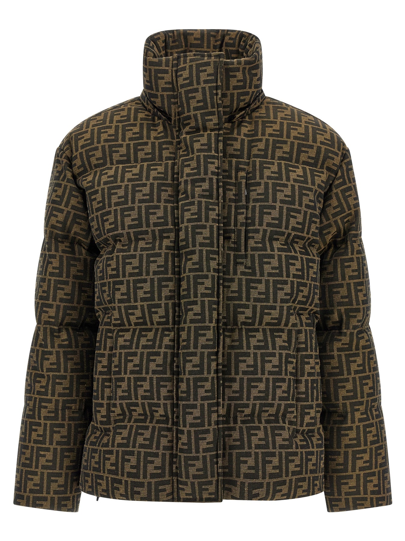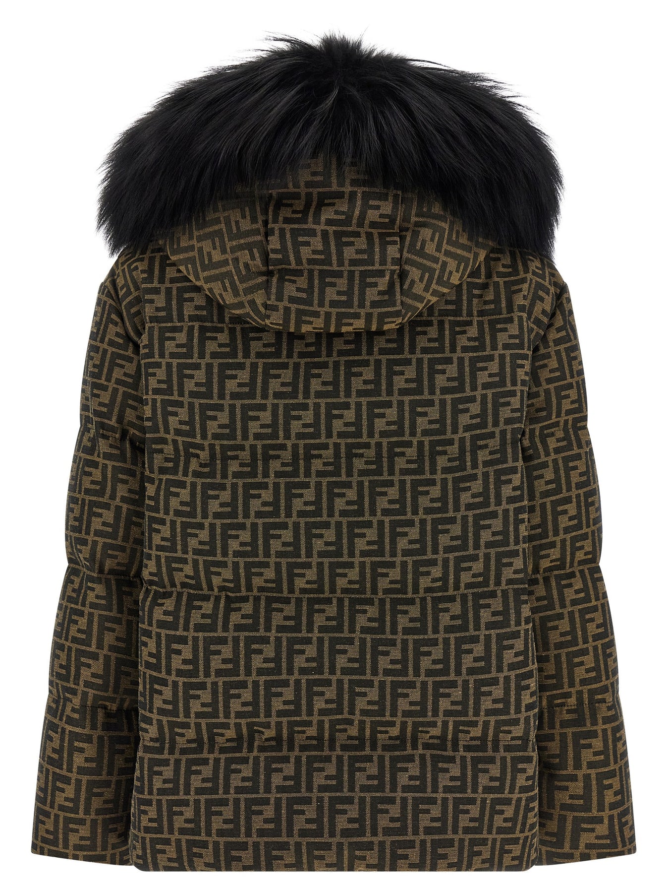 FF quilted jacquard fabric quilted and goose feather padded down jacket, adjustable and removable hood with removable faux fur insert, standing collar, zip closure and front snap buttons, pockets, long sleeves, drawstring at the hem.