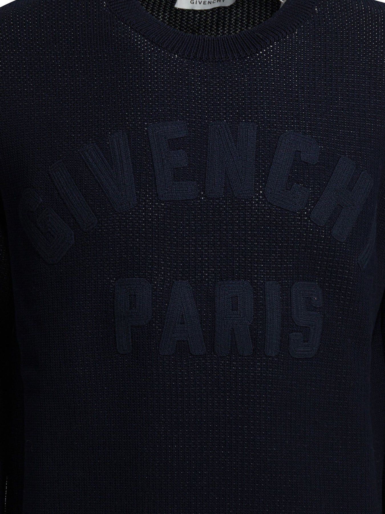 Givenchy embroidered logo sweater, made from cotton knit with a compact texture. It features a clean silhouette with a crew neck construction and long sleeves. The Givenchy Paris logo, inspired by vintage college motifs, is contrastingly embroidered on the front via chain stitch. The collar, hem and cuffs feature ribbed workmanship that provides structure and finish hold. The line is straight, designed for a regular fit. || - Givenchy Paris logo embroidered on the front - Long sleeves - Cotton knit - Ribbed collar, hem and cuffs - Embroidery done in chain stitch - Regular fit