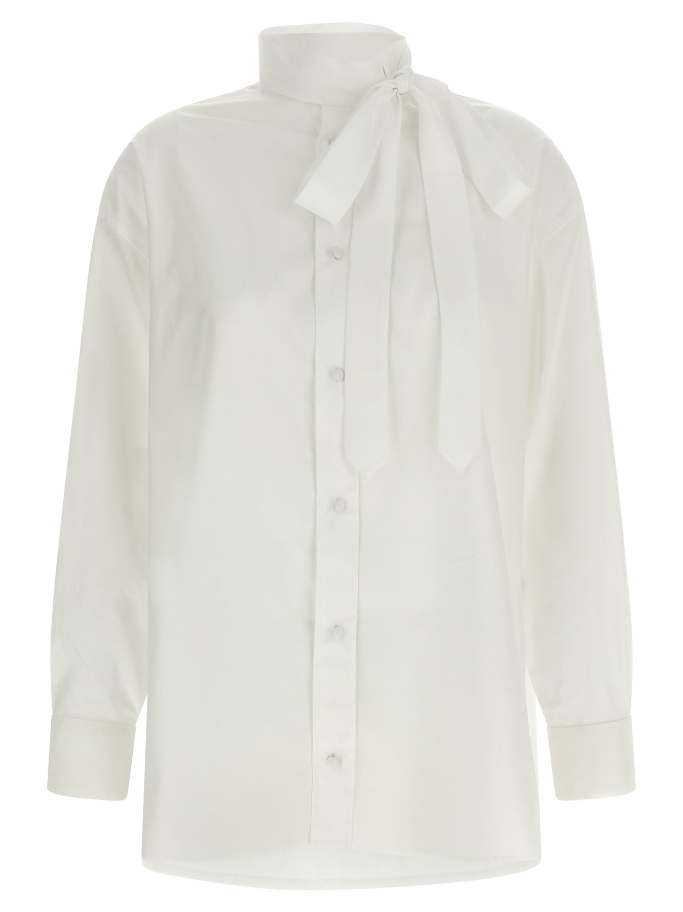 Cotton poplin shirt with lavallière collar, tone-on-tone embroidered logo and front button closure, long sleeves with cufflinks, dropped shoulders, side slits.