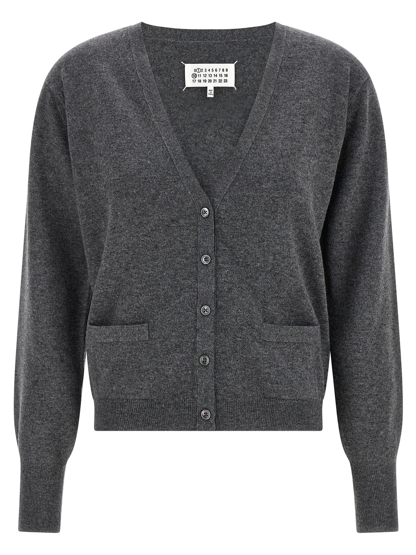 Mélange virgin wool cardigan, V-neck, front button closure, pockets, long cuffed sleeves, back 'Four Stitches', headband.