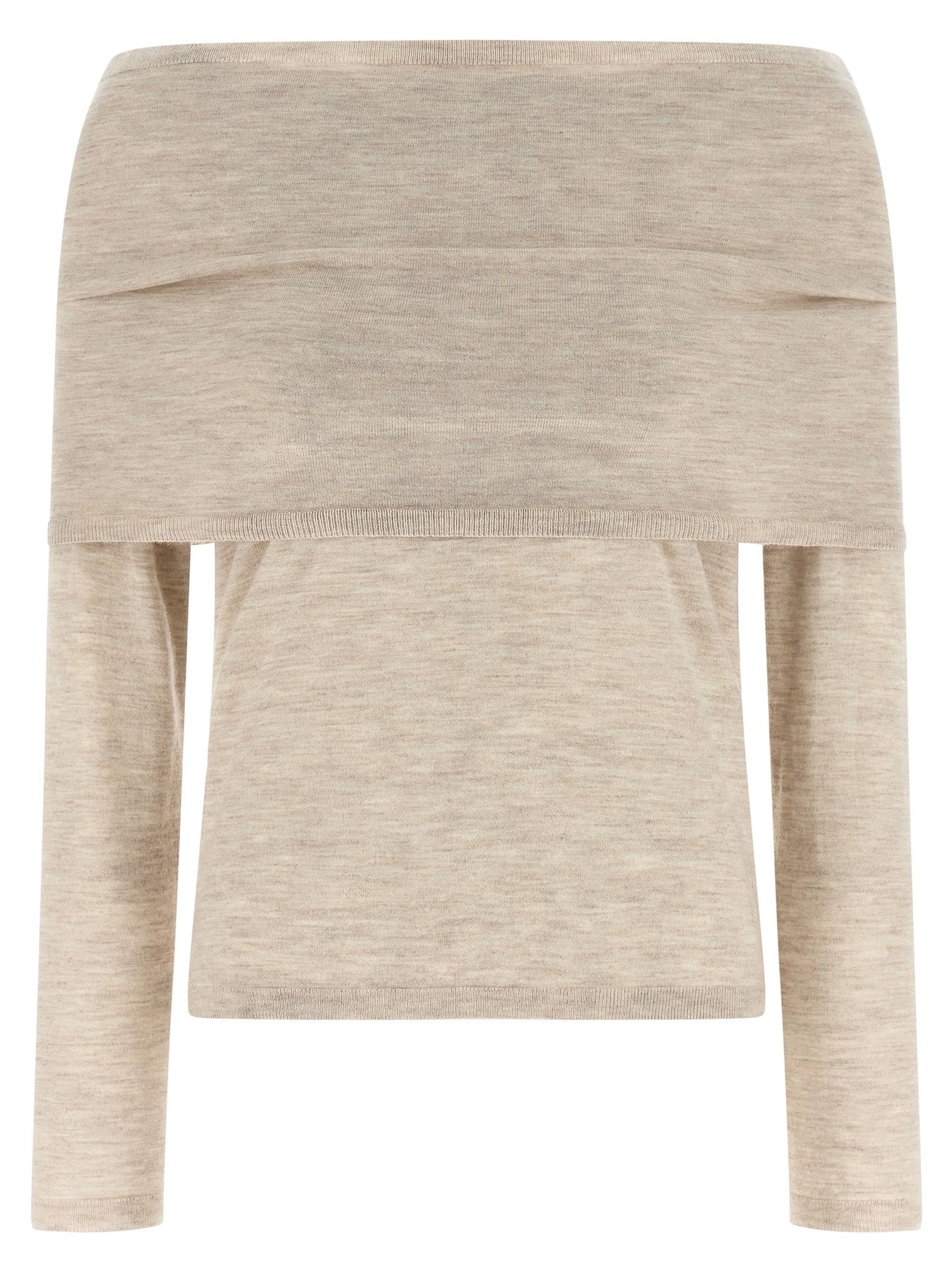 'Mxmfaretra' sweater in light pure cashmere mélange yarn with shaved stitch, boat neck, long cuffed sleeves. Removable matching fabric band to be placed on the shoulders.