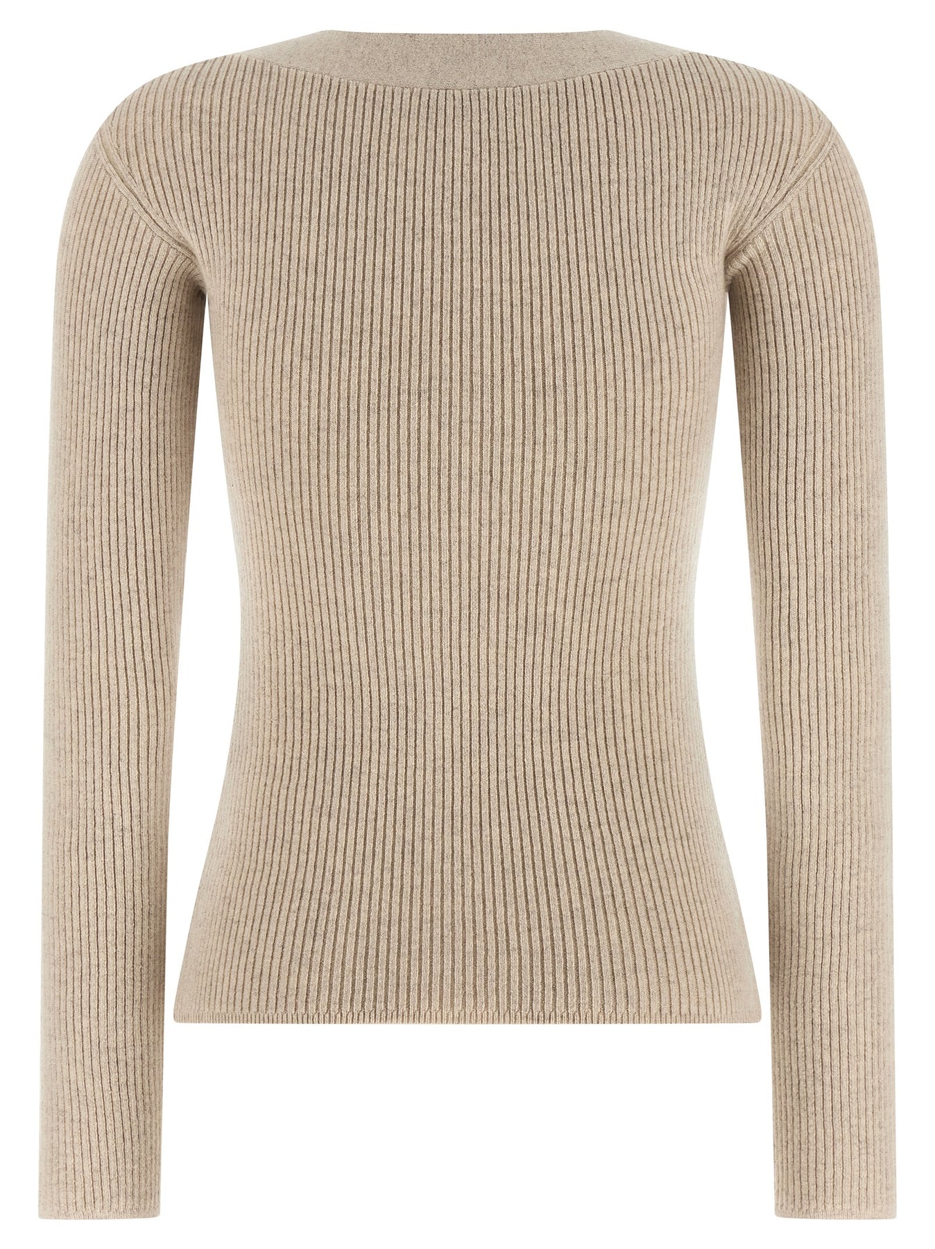 'Mxmgioiosa' ribbed wool and cashmere yarn sweater, wide V-neck, trompe l'oeil button closure on the front, long sleeves with dropped shoulders.