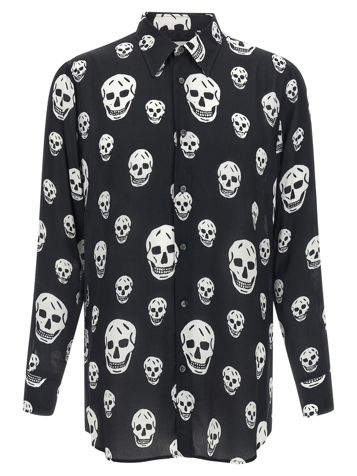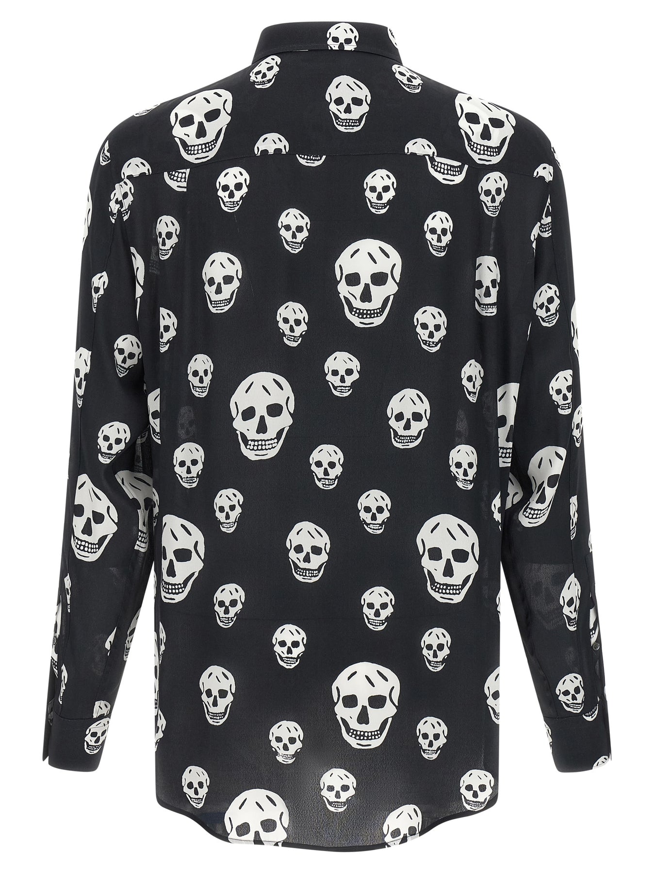 All-over 'Skull' print crepe de chine and viscose shirt, front button closure, long cuffed sleeves, and asymmetrical hem.