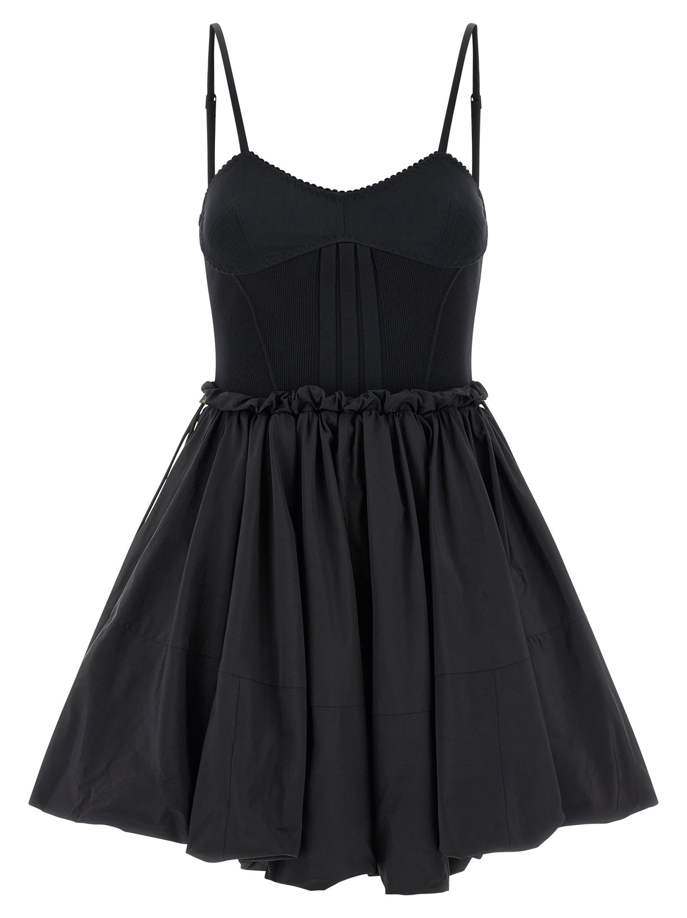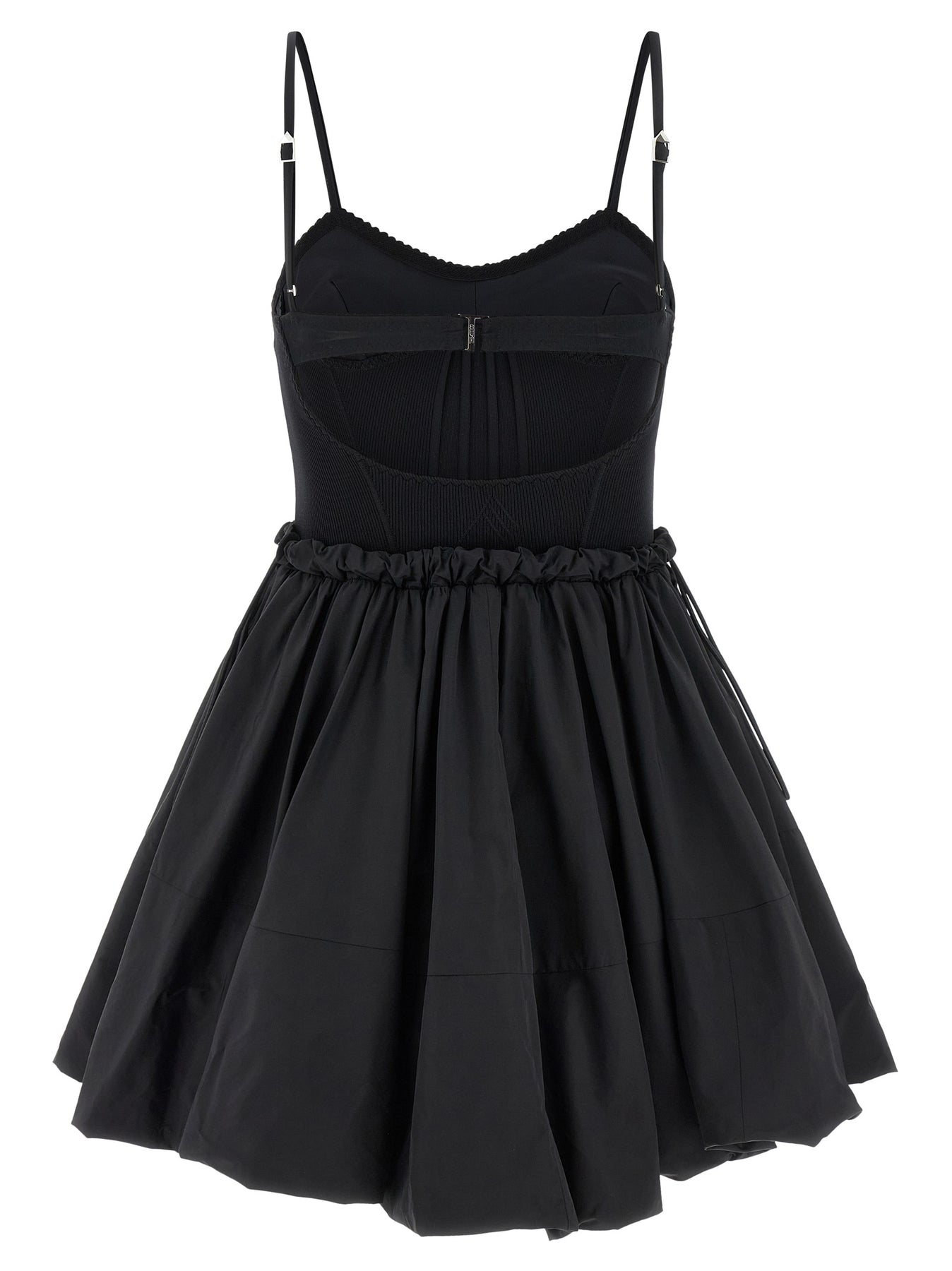 Mini dress consisting of stretch cotton bustier top, thin adjustable straps, wide neckline and back hook closure with cut-out detail, sleeveless and a full taffeta skirt with drawstring at the waist.