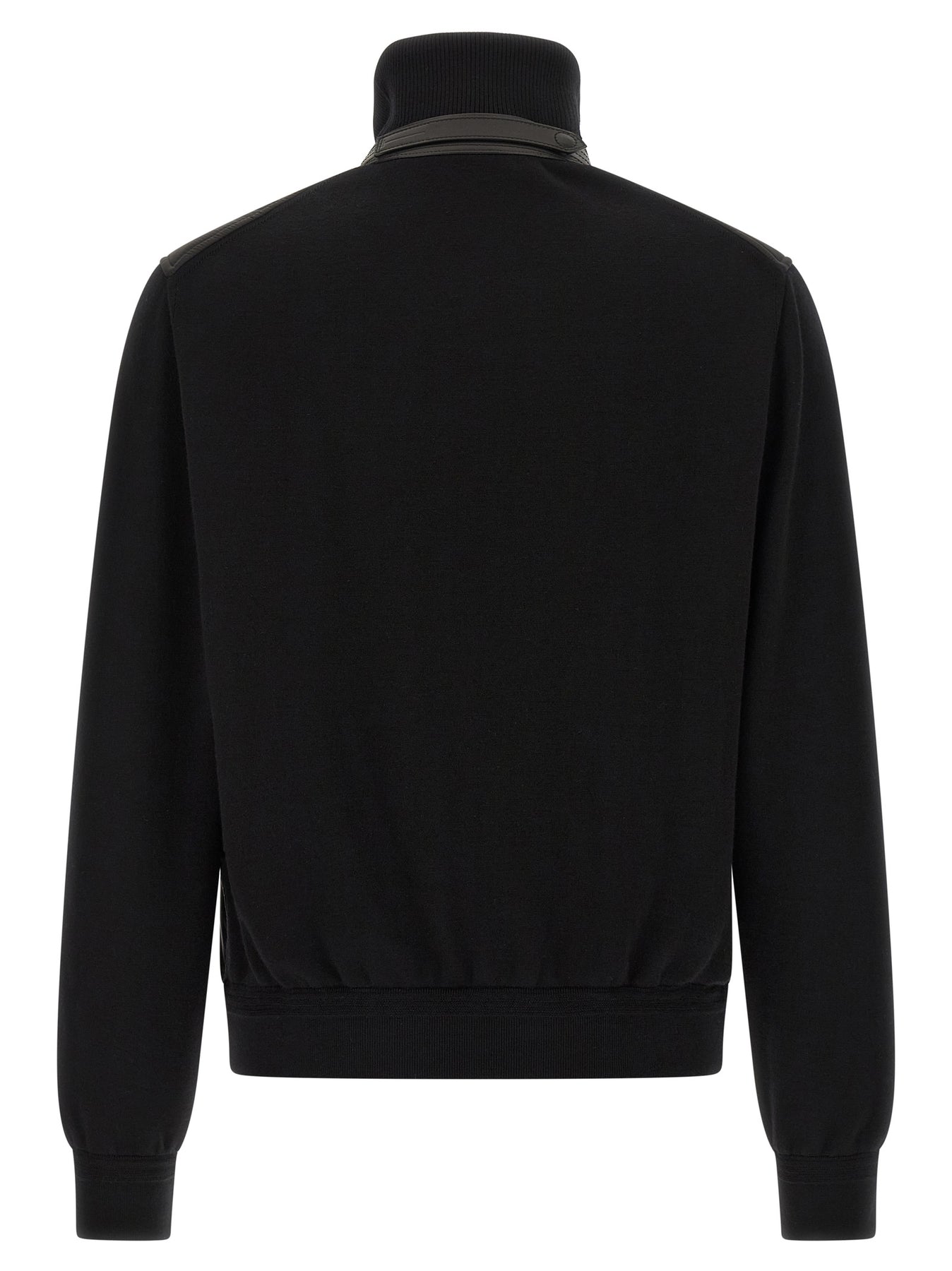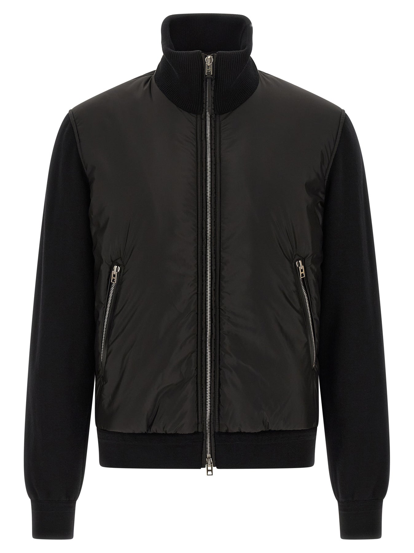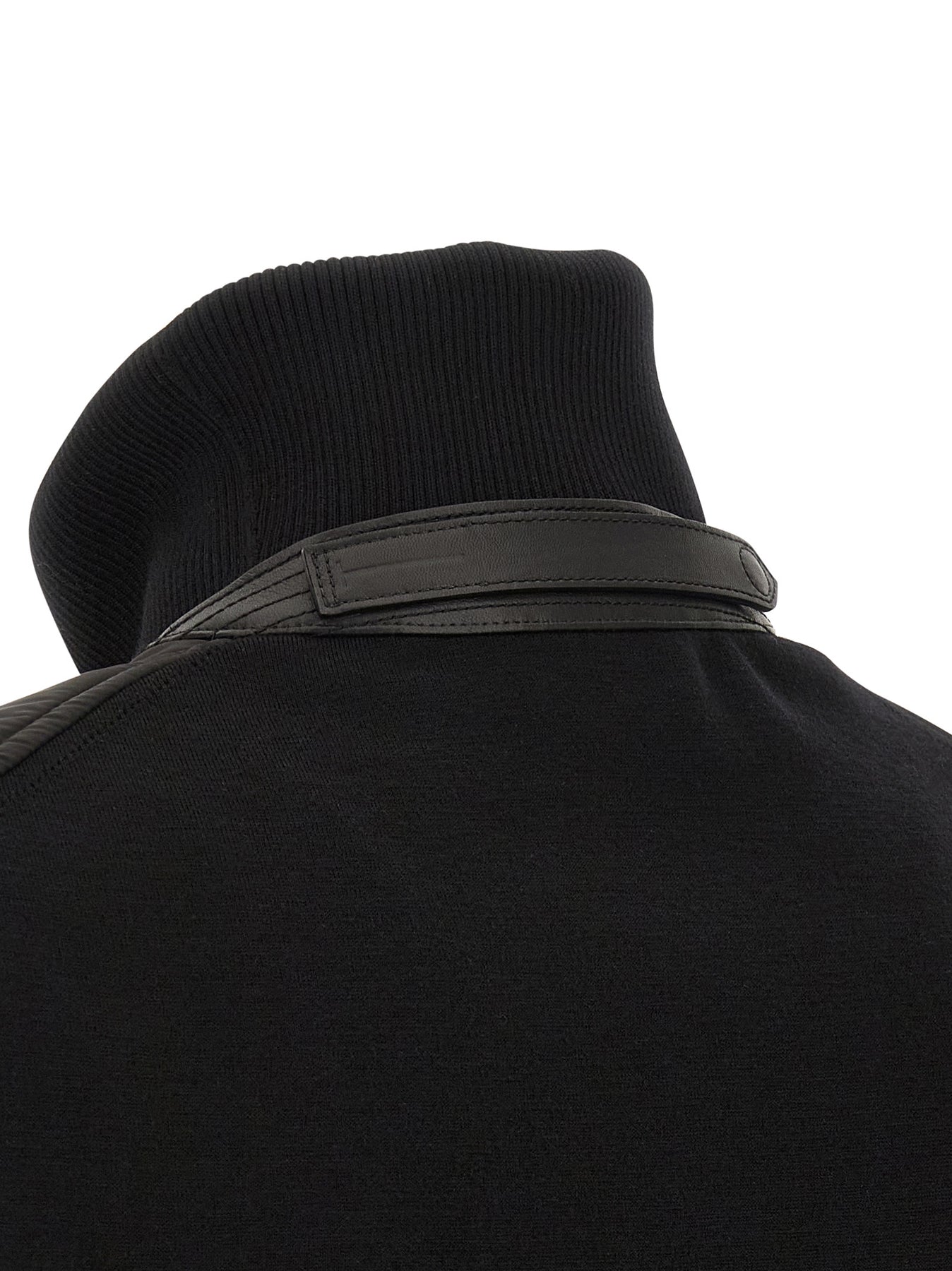 Extra fine merino wool bomber jacket with tone-on-tone padded nylon front vest, ribbed stretch knit high neck with tone-on-tone leather back, front zip closure, pockets, long cuffed sleeves, and headband.