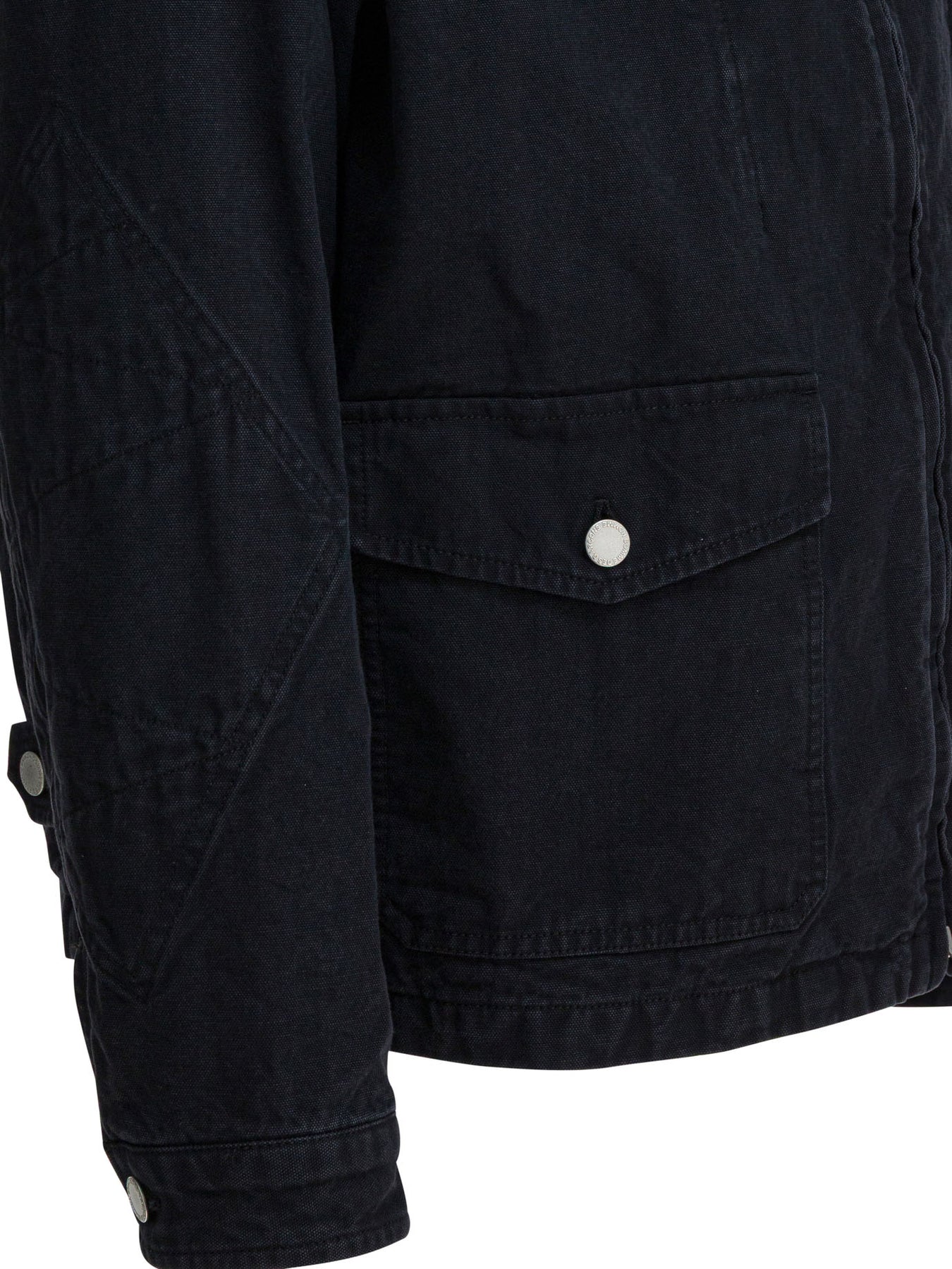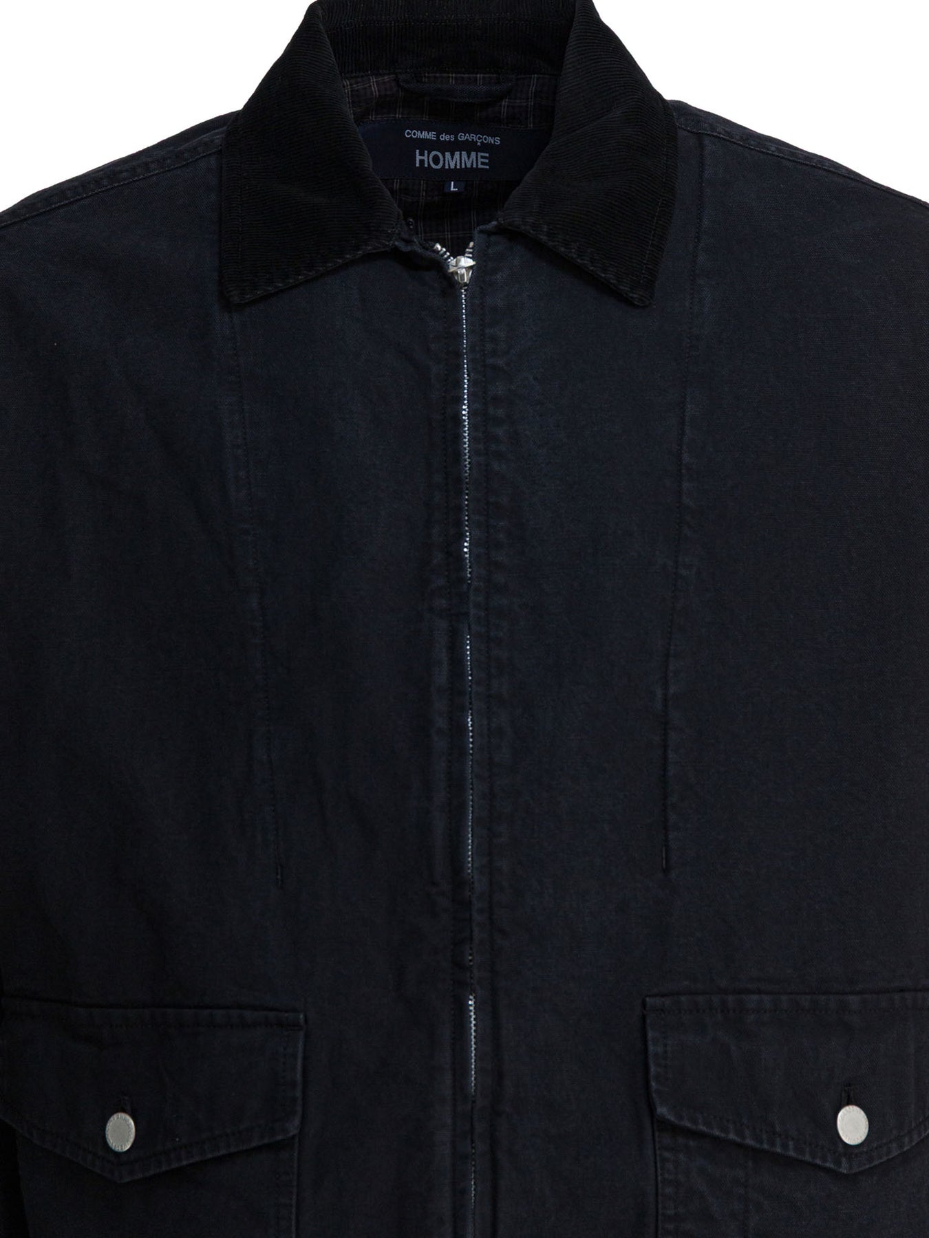 Comme Des Garçons Homme zippered denim jacket made from cotton fabric features a linear construction with a ribbed collar. The silhouette is defined by the regular cut and fitted sleeves. The front closure is entrusted to a metal zipper. The model integrates angled pockets and additional side pockets with snap button closure. Visible trimming and stitching enhance the essential construction. || - Solid color - Ribbed collar - Front zipper closure - Angled pockets - Snap button pockets - 100% cotton fabric - Regular fit