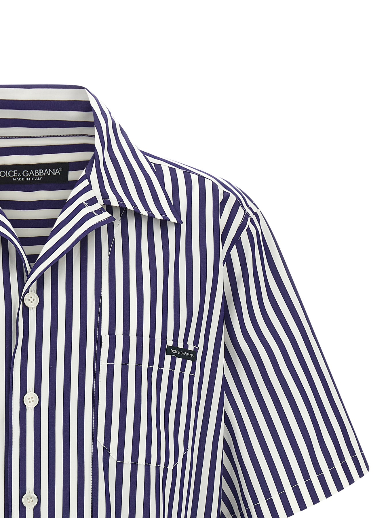 Striped cotton and silk blend poplin shirt, pajama model, logo patch pocket, front mother-of-pearl button closure, short sleeves, side slits.