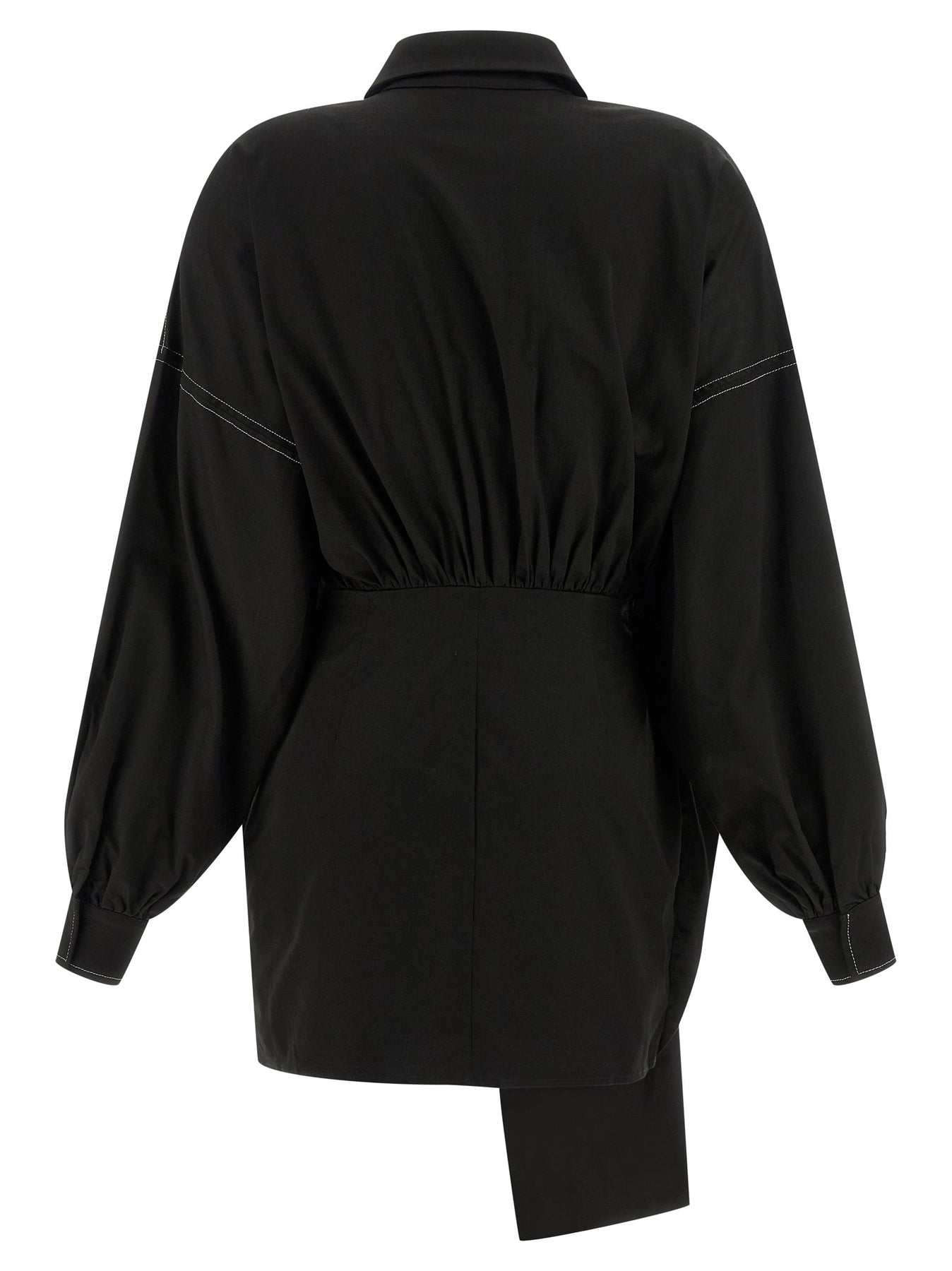 Stretch cotton mini dress with contrast stitching, oversized chemisier top, concealed front button closure, long wide sleeves with cuffs and dropped shoulder, skirt with side inserts to tie into a front bow, side zip closure.