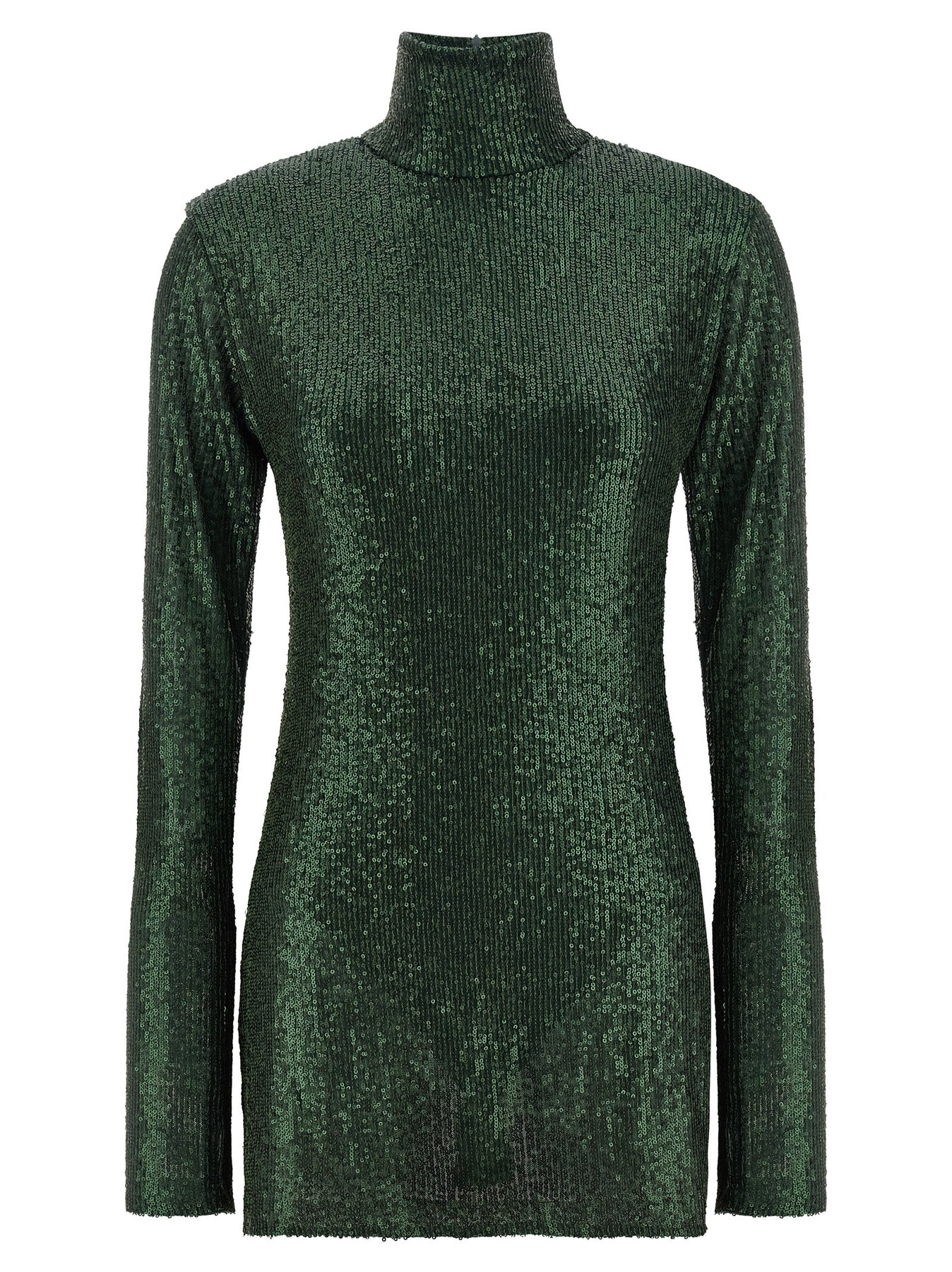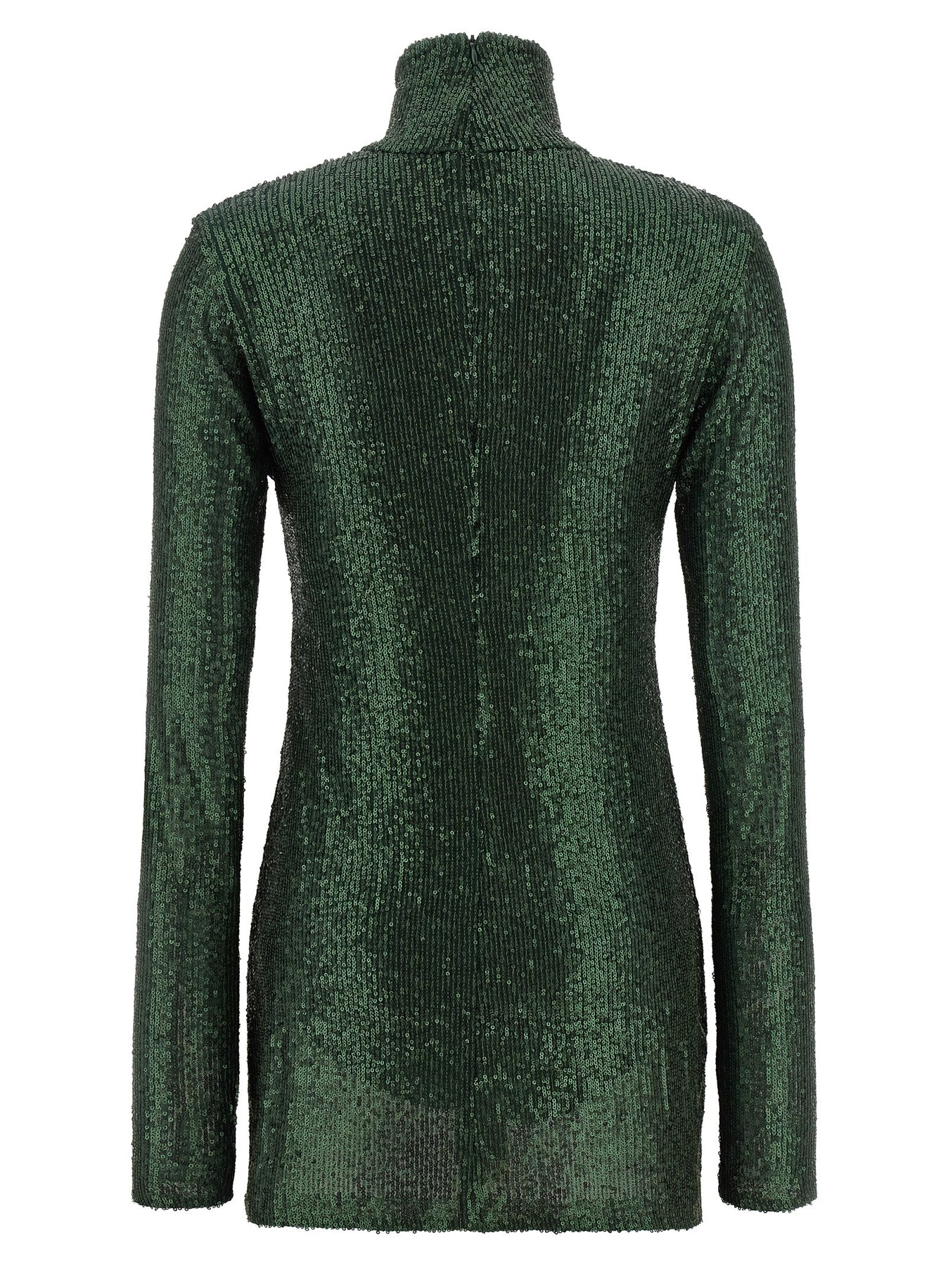 'Pickleball' minidress in fabric covered with all-over sequins, high neck, long sleeves with thumb hole, integrated elastic bodysuit, back zip closure.