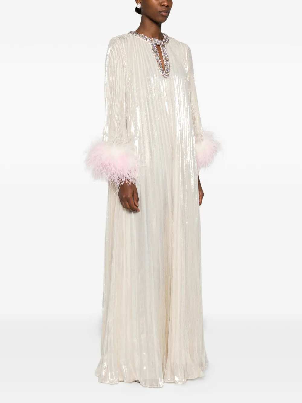 Long dress with feathers Features Champagne Feathered cuffs Decorative neckline Long sleeves Pleated design Composition Shell: 67% silk, 50% ostrich feathers, 50% turkey feathers, 33% metallic fiber Lining: 100% polyester Care Instructions Dry clean only ID RS26507XCH