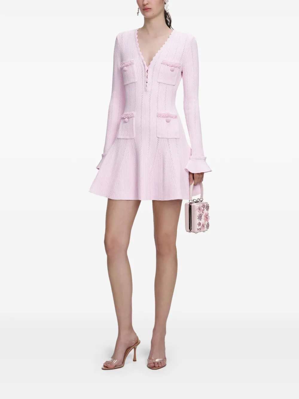 Short dress with embellishment Features Pink Pearl embellishment Patch pocket Long sleeves V-neck Composition 53% viscose, 45% polyamide, 2% spandex/elastane Washing instructions Read the manufacturer`s instructions ID RS26163SP