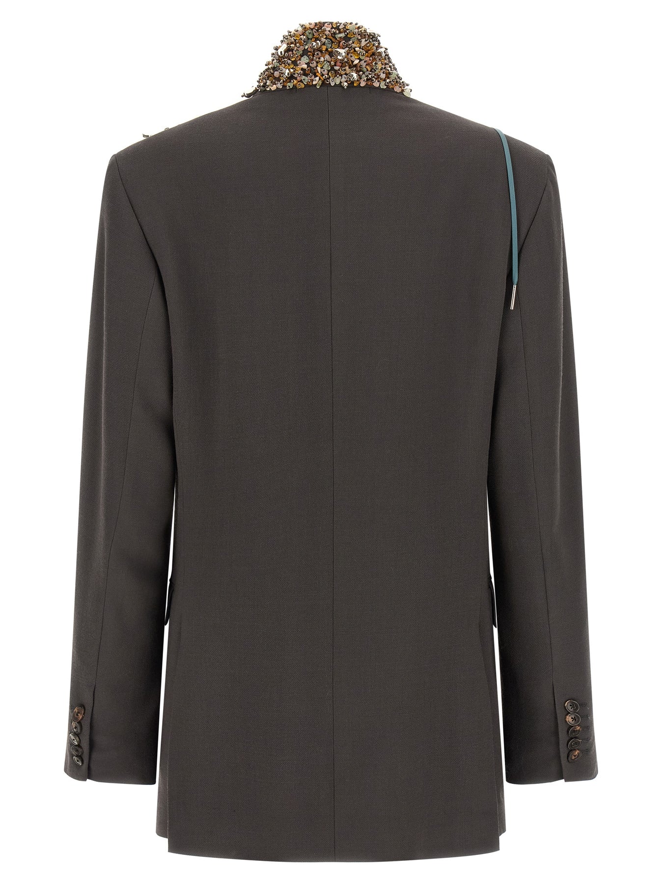 'Befya' double-breasted wool blazer with front button closure, collar and front part with crystal sequins and metal electroformed form elements, flap pockets, padded shoulder, long sleeves, back slits, viscose lining.