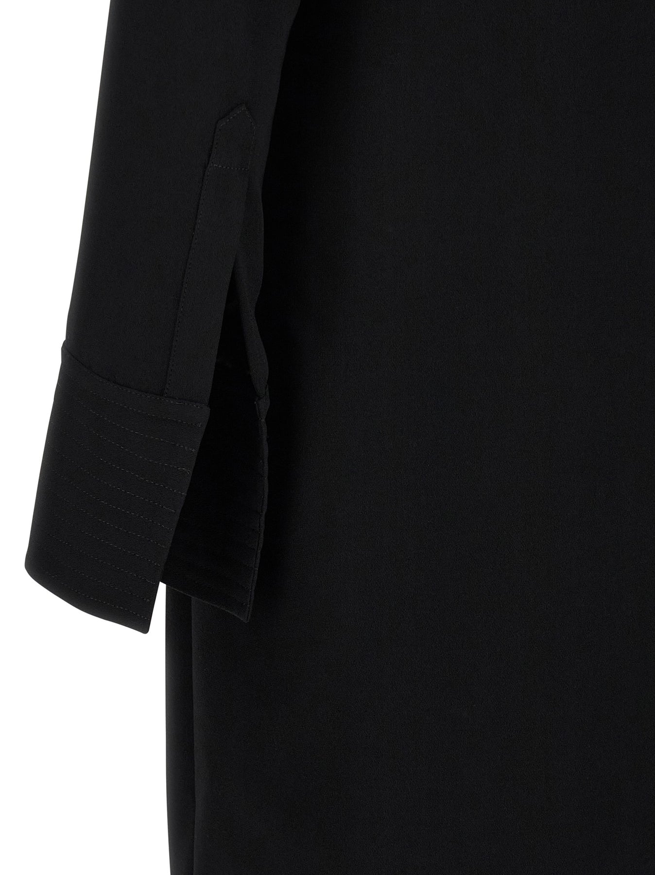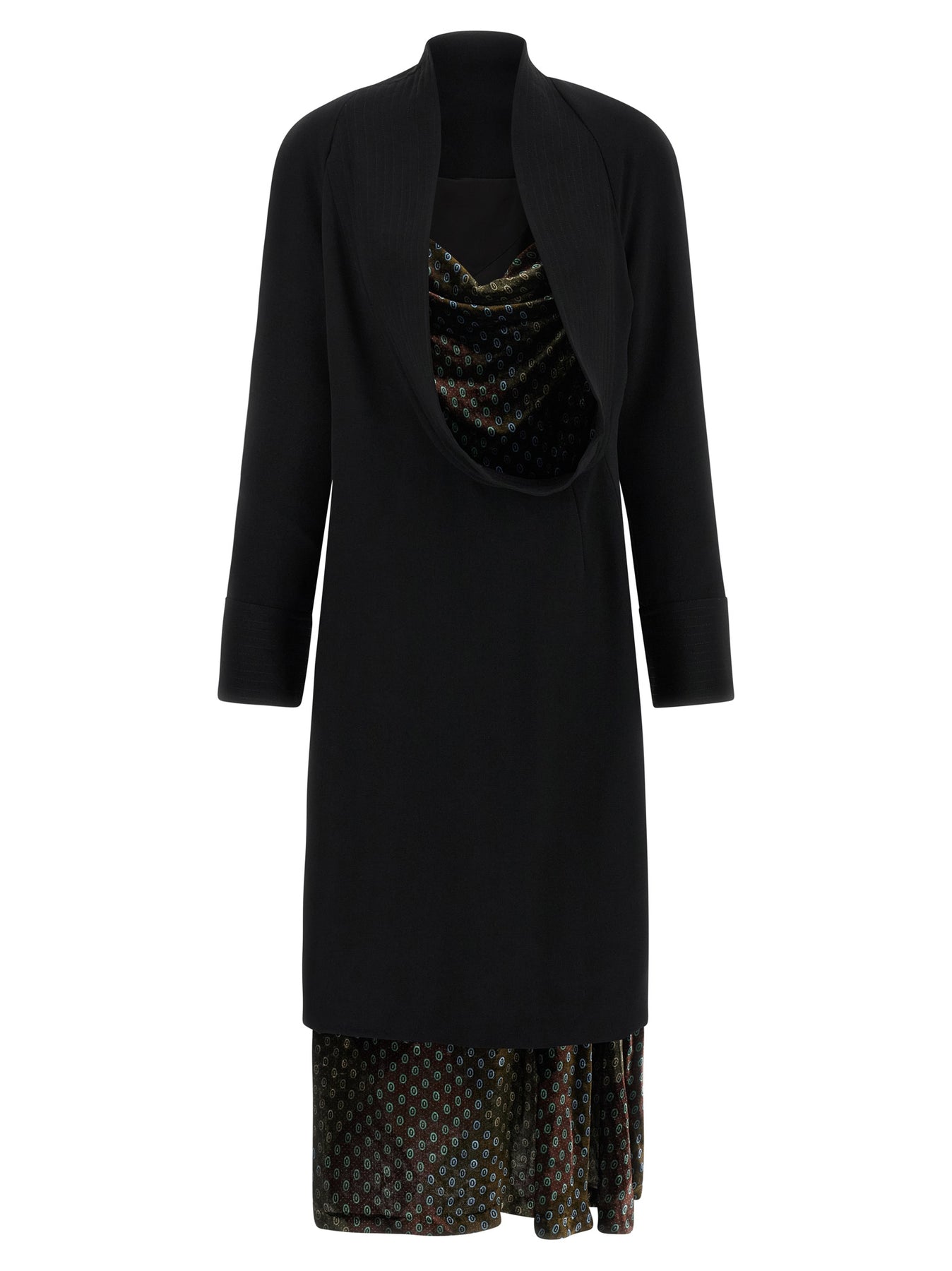 Double layer 'Delsey' midi dress consisting of a solid color outer part with a wide semi-rigid ribbed round neckline, long sleeves with open cuffs, side zip closure and a patterned velvet inner part with a shawl round neckline and a fluid skirt.