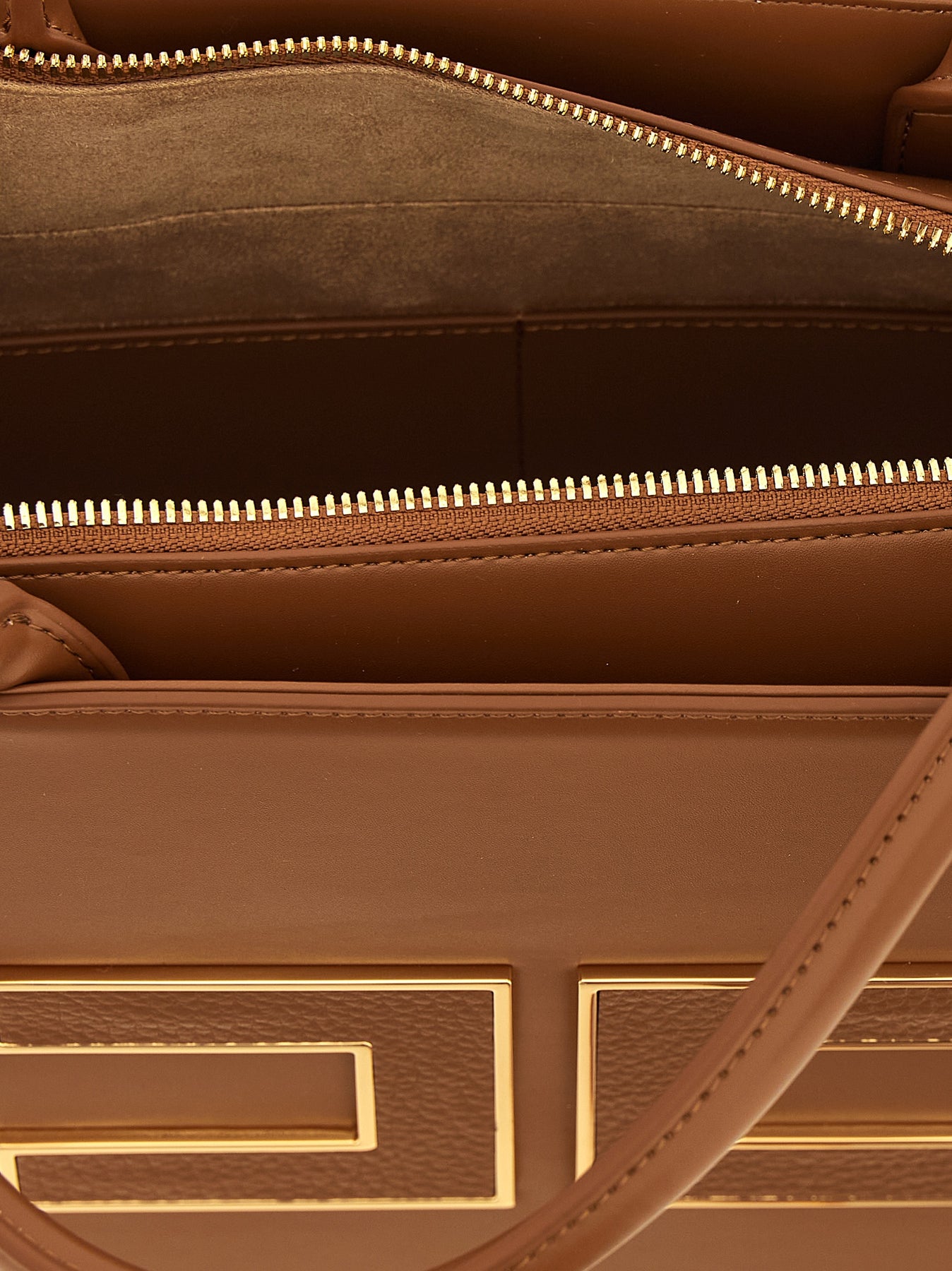 Large shopping bag in smooth leather-effect fabric, maxi metal logo with front hammered leather interior, double fixed handle, top zip closure, adjustable and removable shoulder strap.